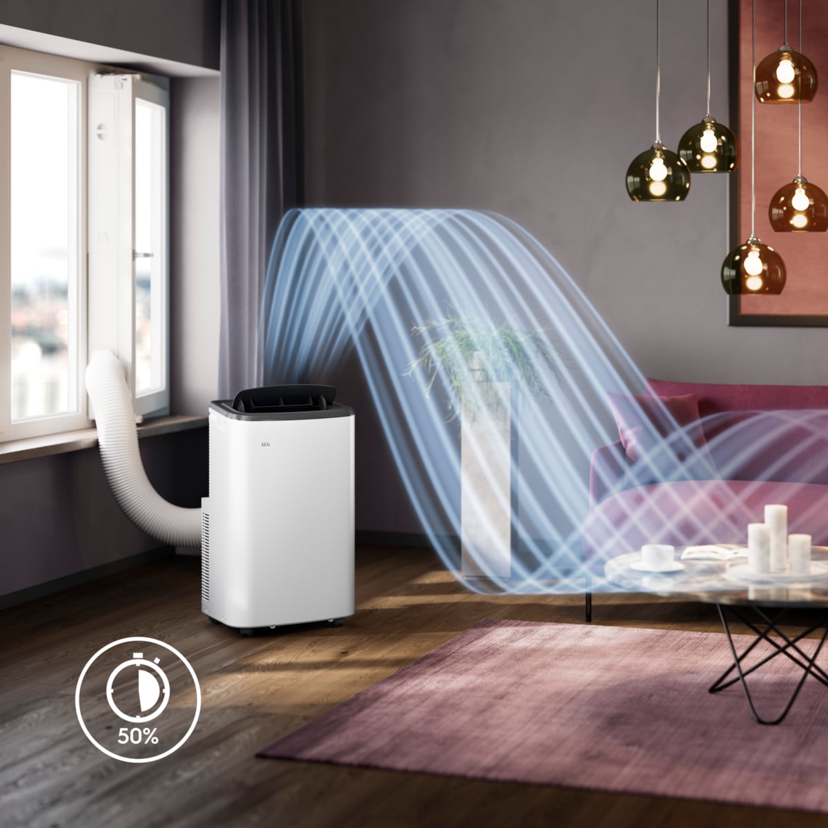 *T° ambiente de 26 °C e T° definida de 24 °C: a T° definida é alcançada em 19 min. com o kit de janela Premium e, num espaço sem kit de janela, em 47 min. Teste interno num espaço de 14 m2, com humidade relativa de 60 % e T° exterior de 30 °C. Testado com o modelo AEG 9K, classificação A.