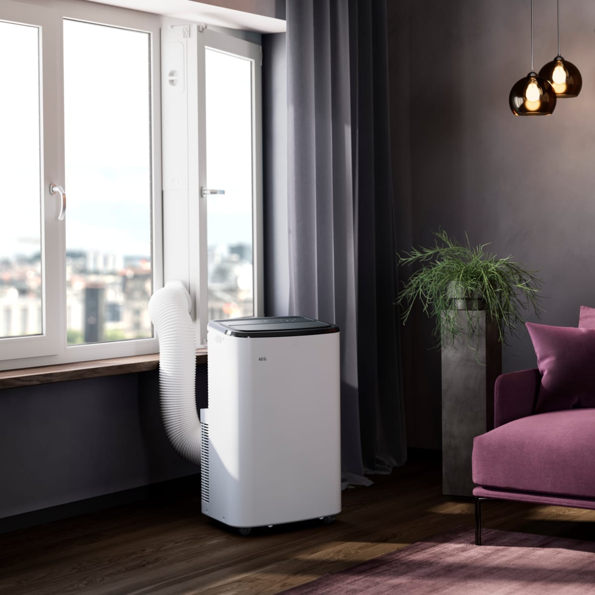 *T° ambiente de 26 °C e T° definida de 20 °C: poupança energética de 28 % com o Kit de janela Premium até alcançar a temperatura definida. Teste interno com um modelo AEG 9K de classificação A, num espaço de 14 m2, com humidade relativa de 60 % e T° exterior de 30°C, num prazo de 4h30min.