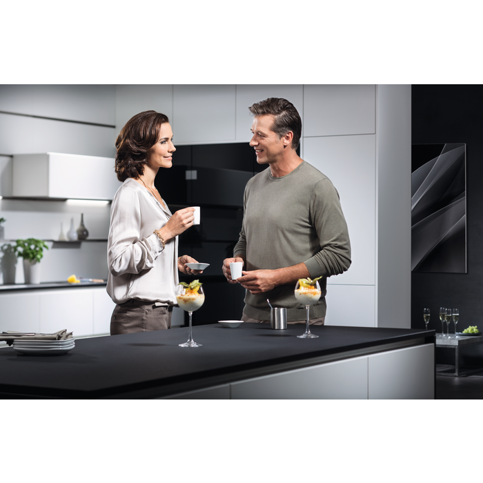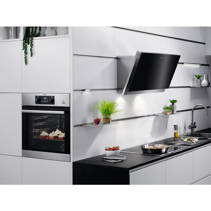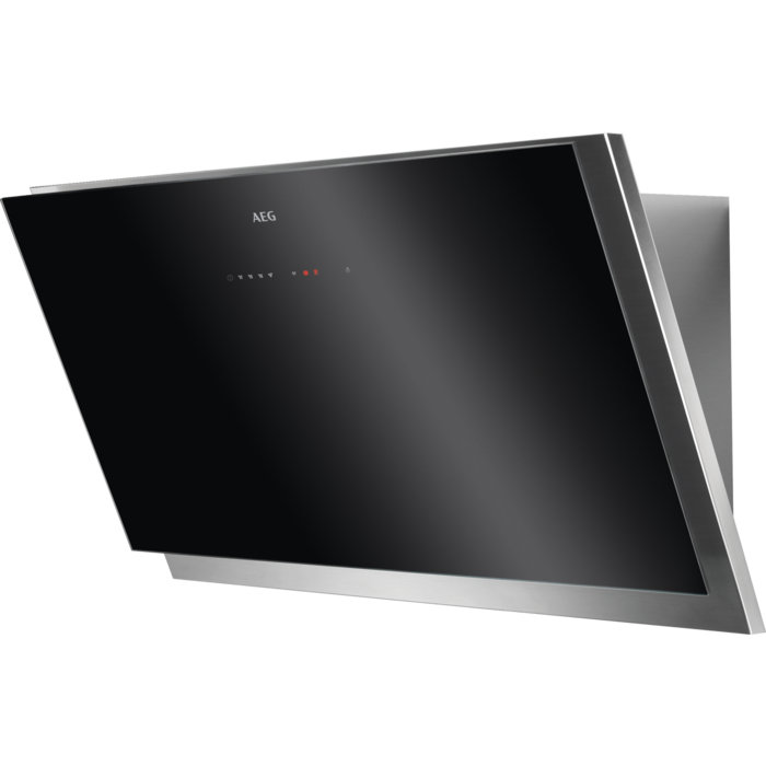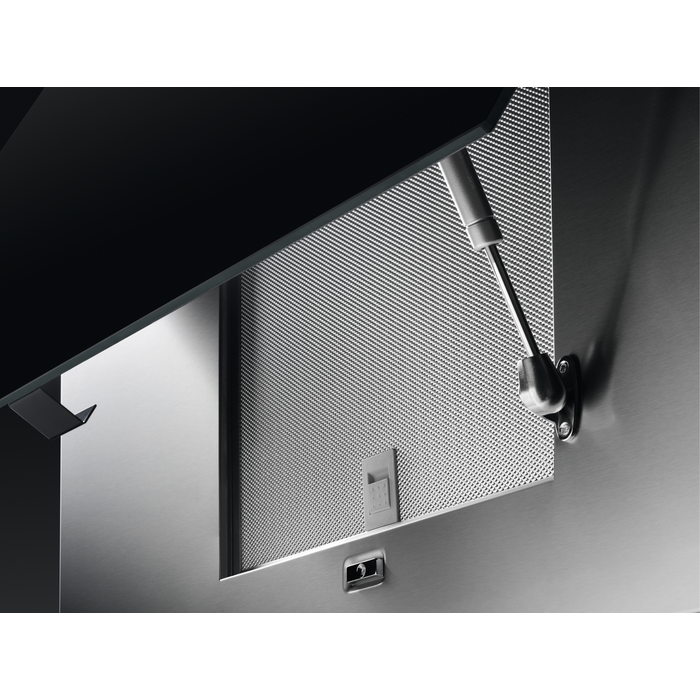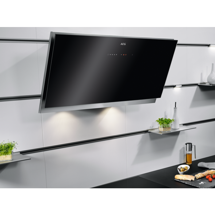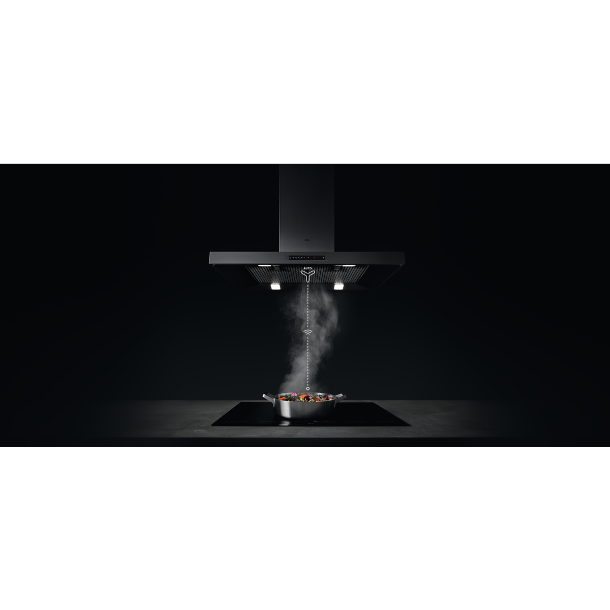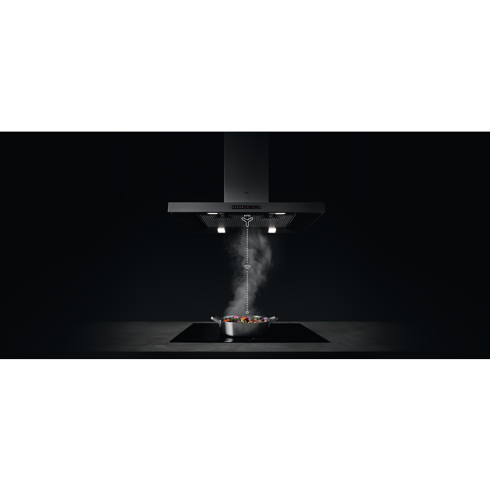 Chaminé de Parede «Face Flush» de 90 cm preta com sistema «Hob2Hood» de sincronização automática com uma placa compatível, Função «Brisa», 4 níveis de potência (3+1), Potência máxima de 700 m3/h, Tecnologia «SilenceTech» com nível de ruído mínimo de 51 dB(A), Iluminação LED, Classe A