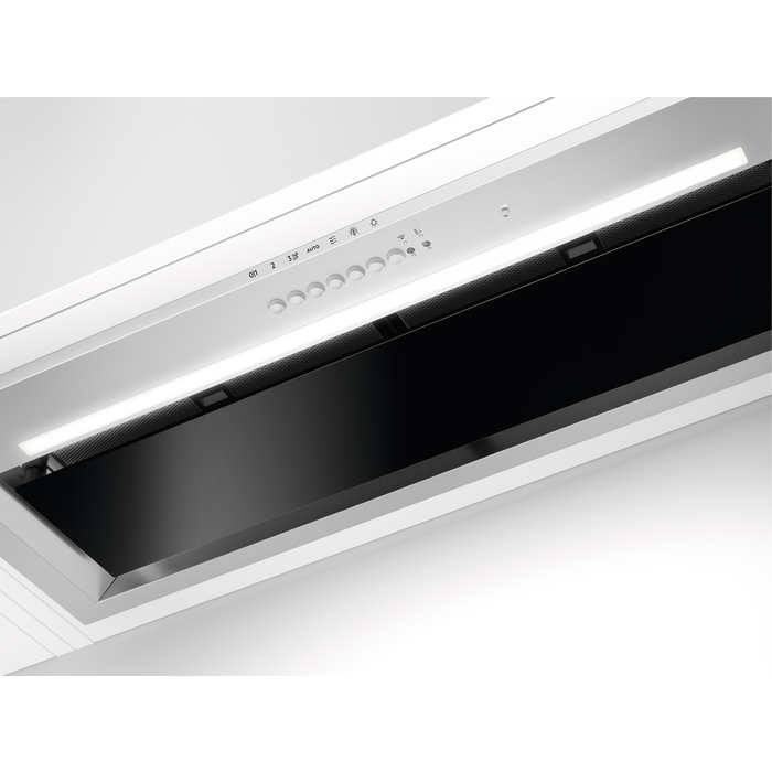 Exaustor de integrar da Série 9000 de 90 cm e 41 dB(A), com três níveis de potência + potência intensiva, função brisa, 680 m³/h, nível máximo de ruído 54 dB(A), controlo eletrónico, iluminação com fita LED Perfect Illumination (2700 a 5000 °K), ajuste automático de extração AutoSense, INOX e Black Glass