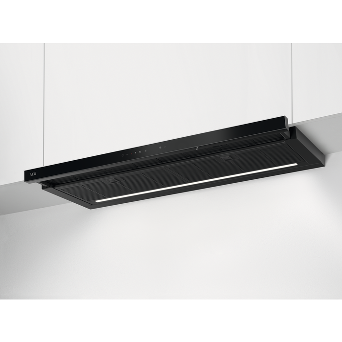 Exaustor telescópico da Série 8000 de 90 cm e 44 dB(A), Iluminação perfeita com três níveis de potência + potência intensiva, função Brisa, 650 m³/h, nível máximo de ruído 55 dB(A), controlo eletrónico, iluminação LED Perfect Lighting (2700 a 5000 °K), ligação Hob2Hood com um exaustor compatível, preto