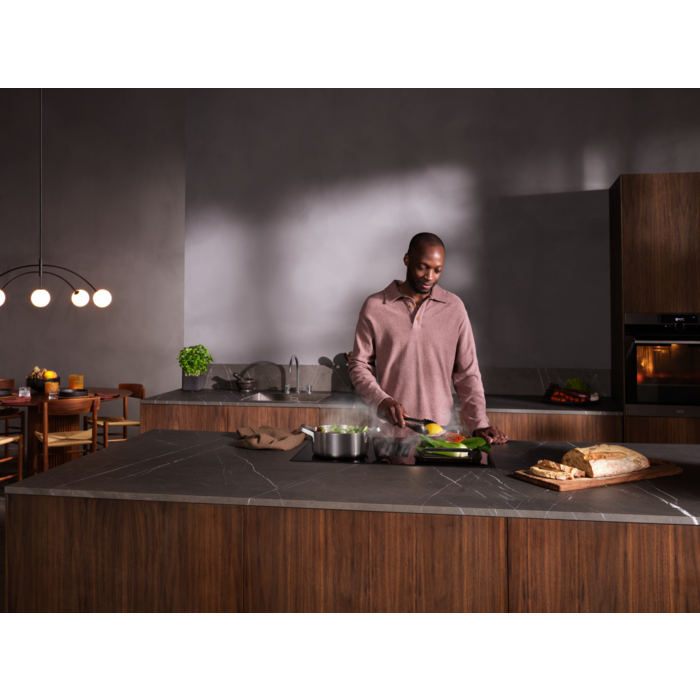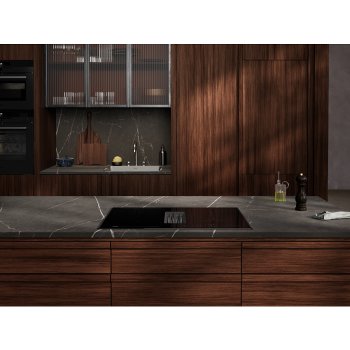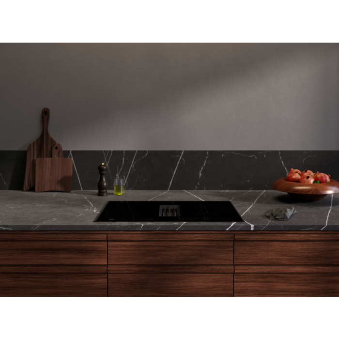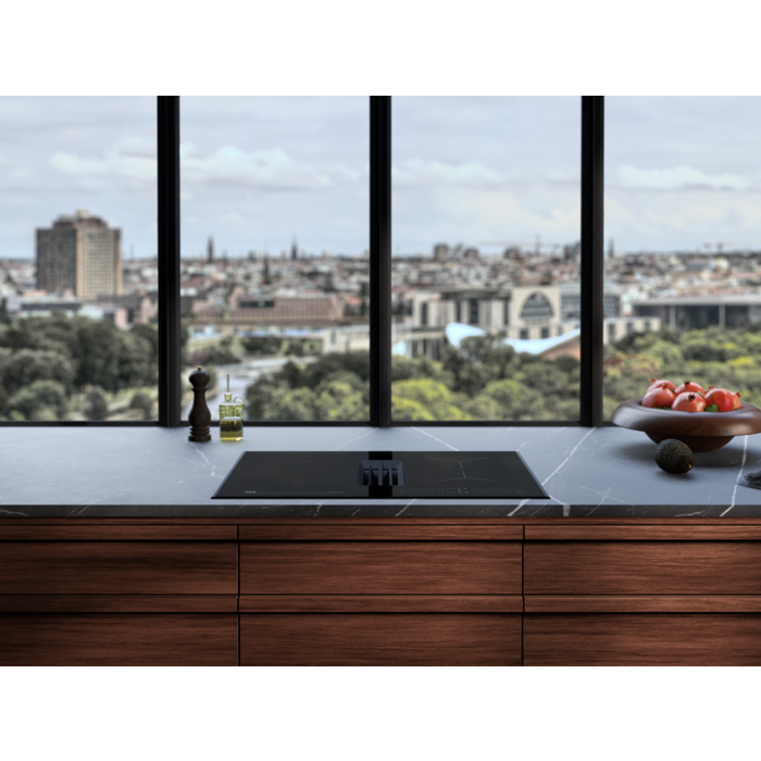 Placa de indução com exaustor integrado da Série 6000 Bridge de 68 cm, com controlos deslizantes (0-9) com temporizador Eco individual, função Power, 3 velocidades de extração + intensiva e modo Auto, capacidade de extração de 650 m³/h, filtro de carvão e de gorduras com indicador de saturação, instalação em modo de recirculação, exaustor A+ (com opção de extração para o exterior com acessórios adicionais)