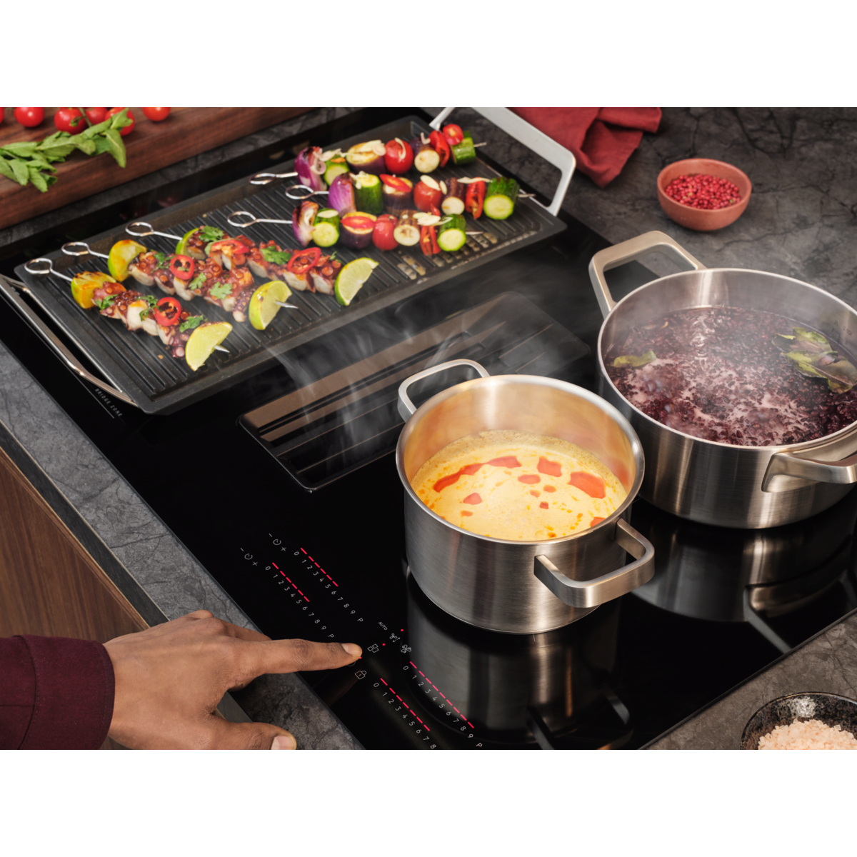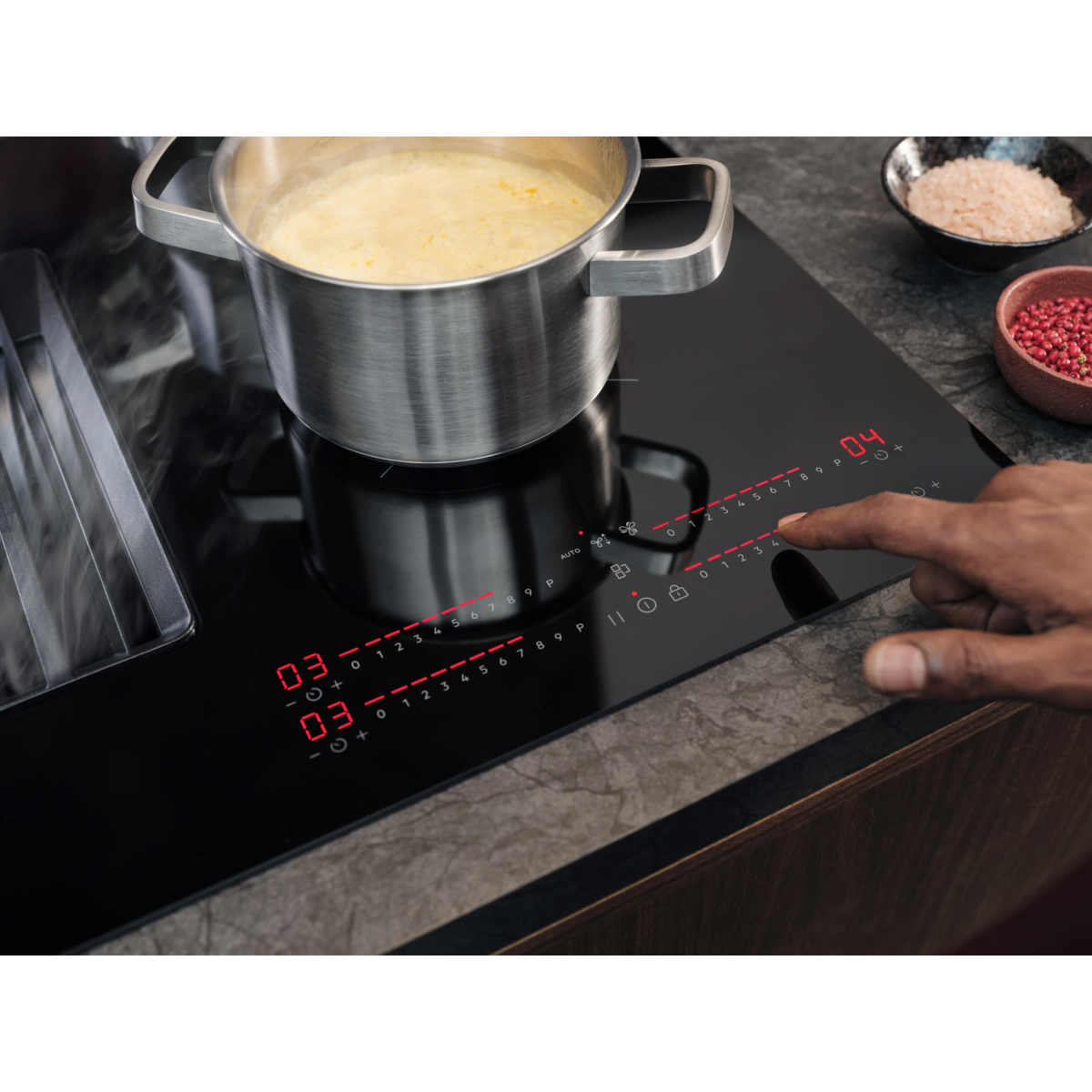 Placa de indução com exaustor de 80 cm da Série 6000 Bridge XT, com função Ponte, controlos deslizantes individuais (0-9), função Power e temporizador Eco individual, 3 velocidades + potência intensiva e modo Auto (650 m³/h), filtro 2 em 1 (carvão + gorduras) com indicador de saturação, instalação em modo recirculação (opção de instalação em modo extração para o exterior com acessórios adicionais), duplo biselado nos lados