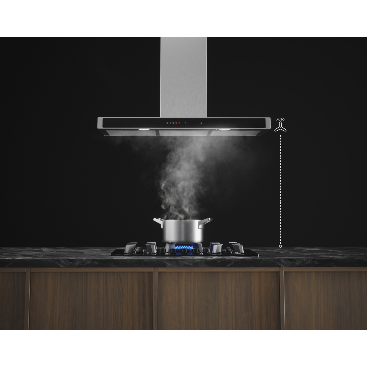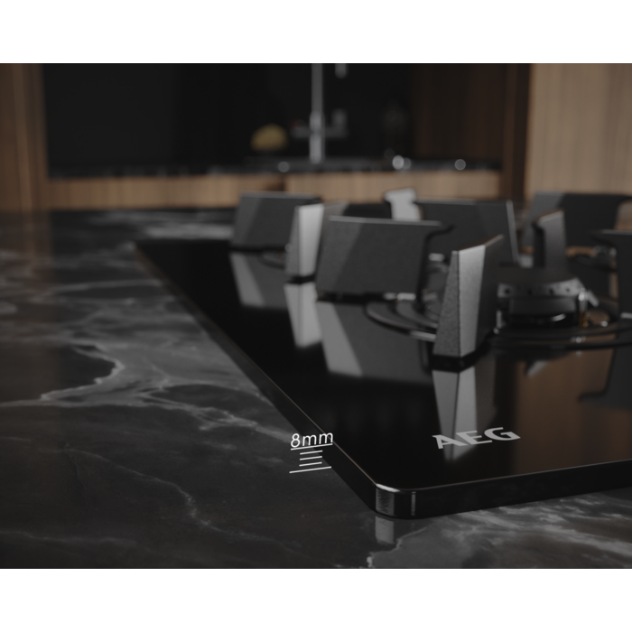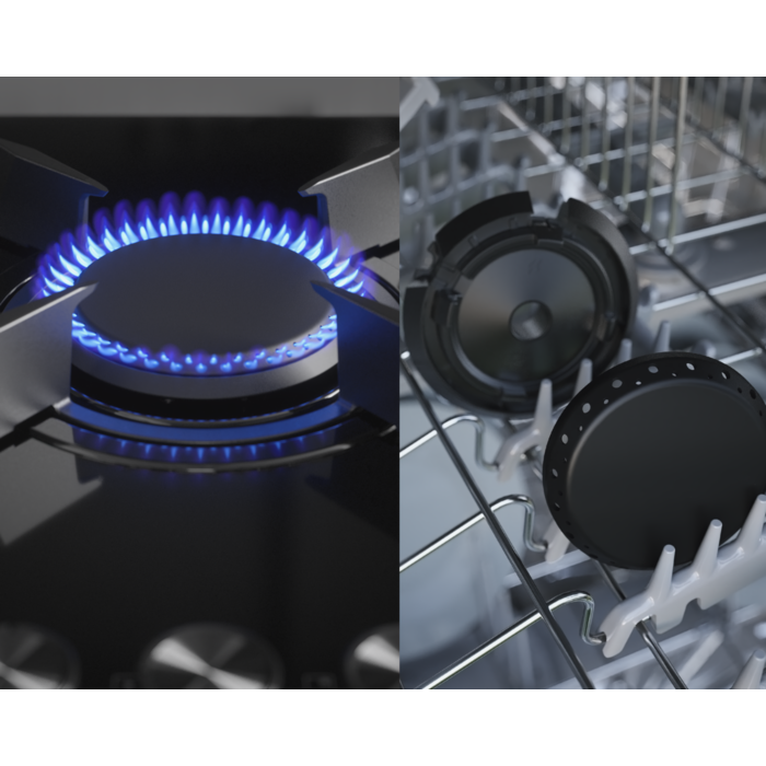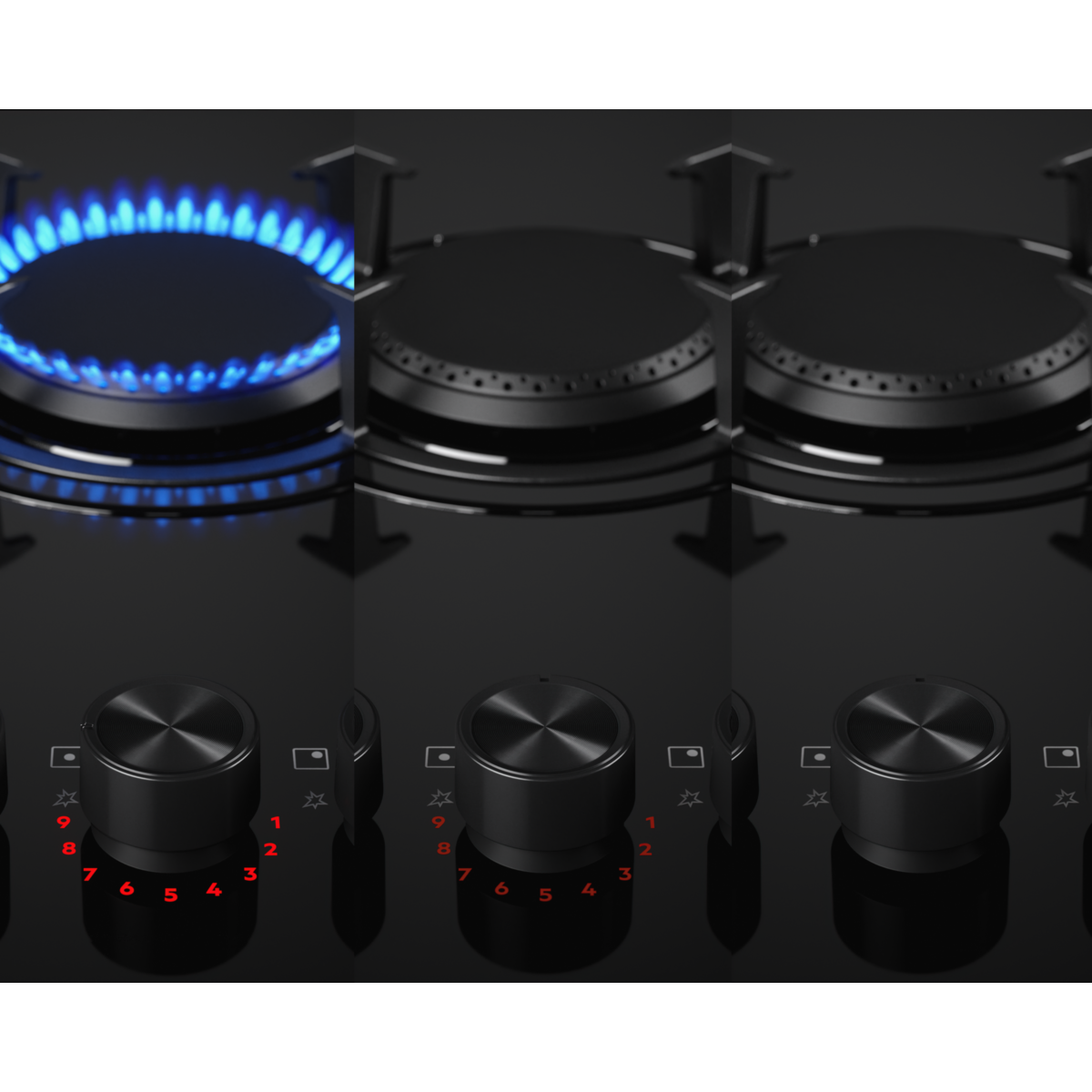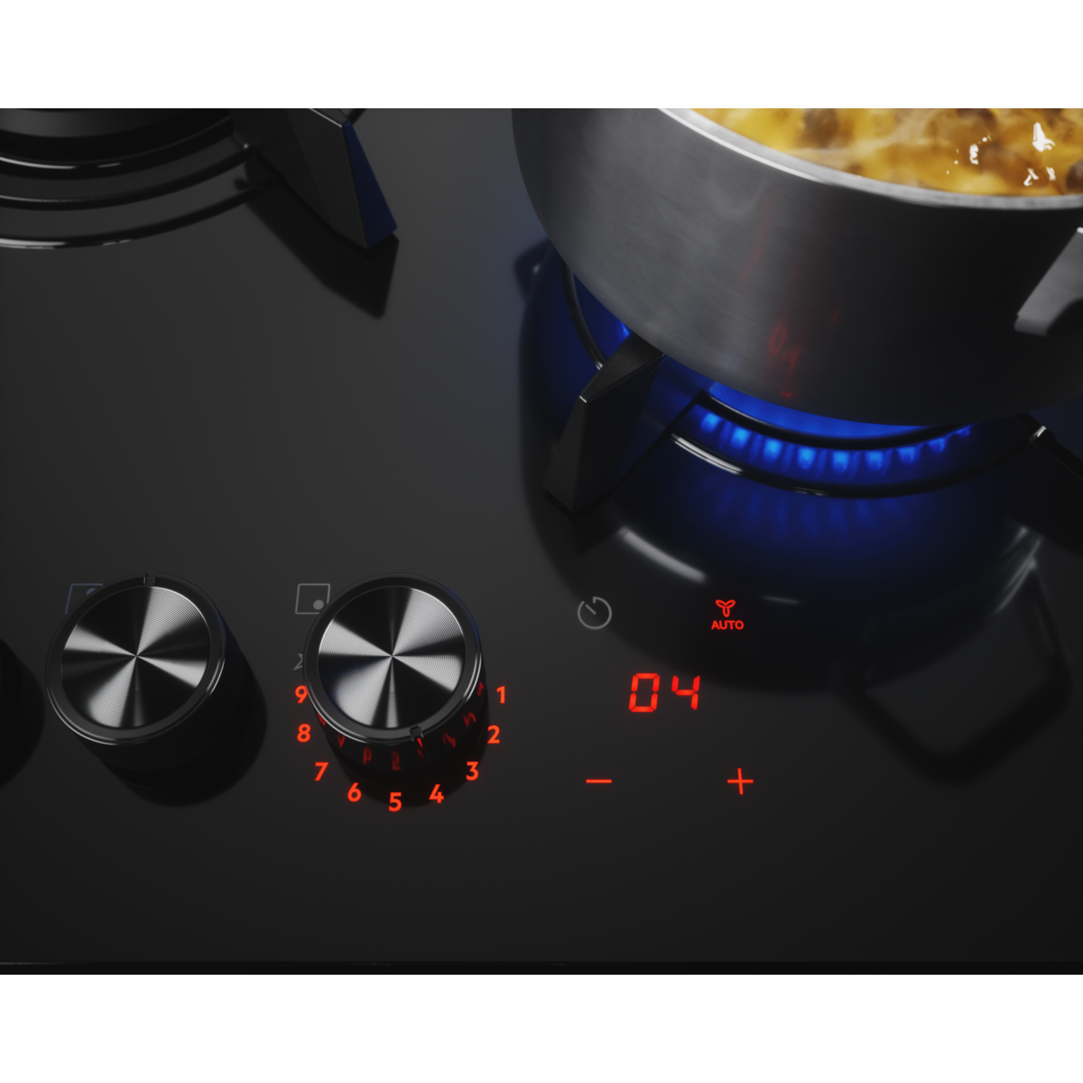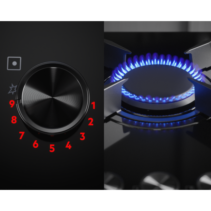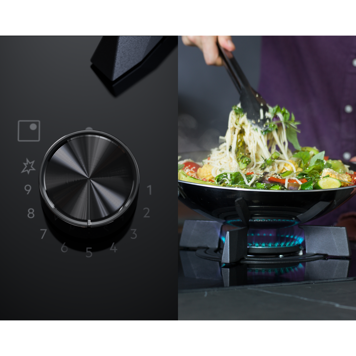 Placa cristalgás de 60 cm com 3 queimadores SpeedBurner + 1 quemador Wok, sistema Hob2Hood de sincronização automática com um exaustor compatível, painel de controlo frontal StepPower LED com 9 níveis de potência e com indicadores de calor residual, cronómetro, termopar de segurança que corta o fornecimento de gás caso a chama se apague acidentalmente, grelhas em ferro fundido