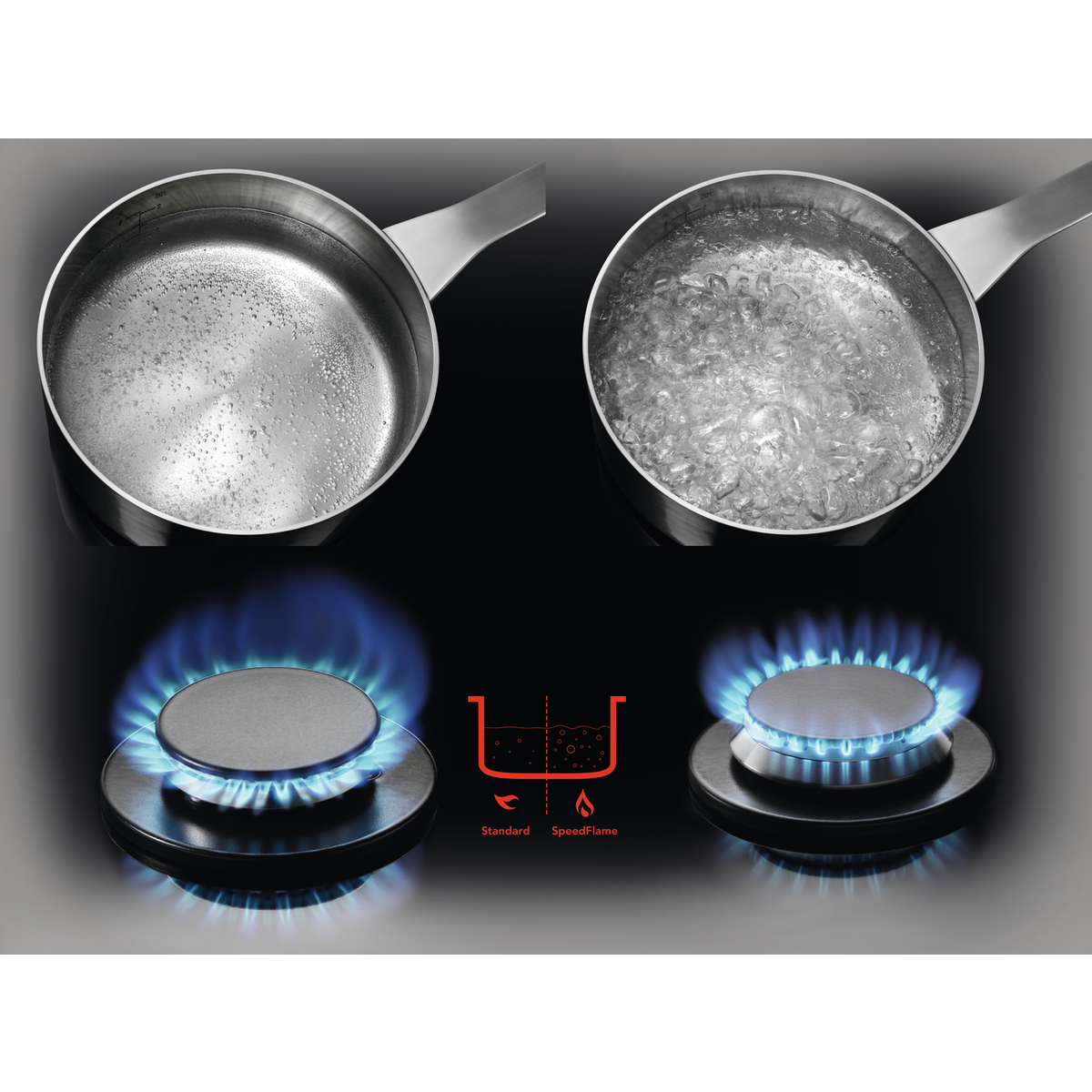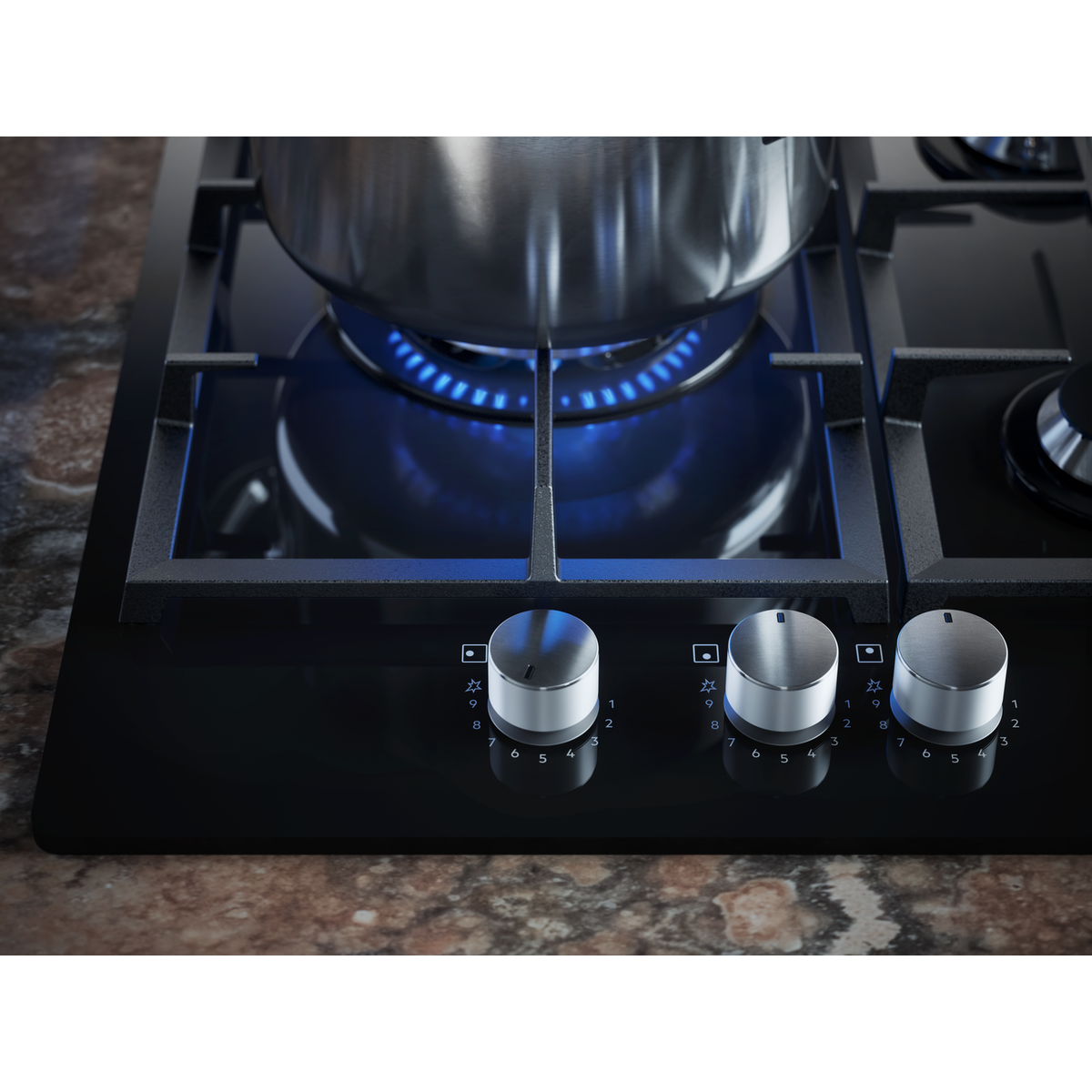 Placa de gás da Série 6000 de 5 zonas e 75 cm, com controlos StepPower (9 níveis de potência), 5 queimadores: 4 SpeedBurner + 1 Wok, sistema de segurança, grelhas de ferro fundido, autoignição eletrônica, compatível com gás natural/butano/propano, vidro preto