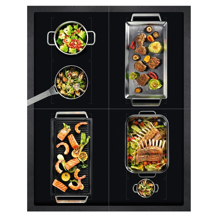 Placa de Indução biselada extra plana MaxiSense® Plus de 60 cm, com 4 zonas Power de 14 níveis de potência, Controlo DirectTouch, conetividade «Hob2Hood» com uma chaminé compatível, funçao FlexiPonte, funçao PowerSlide, Timer, Instalação Easy Fix