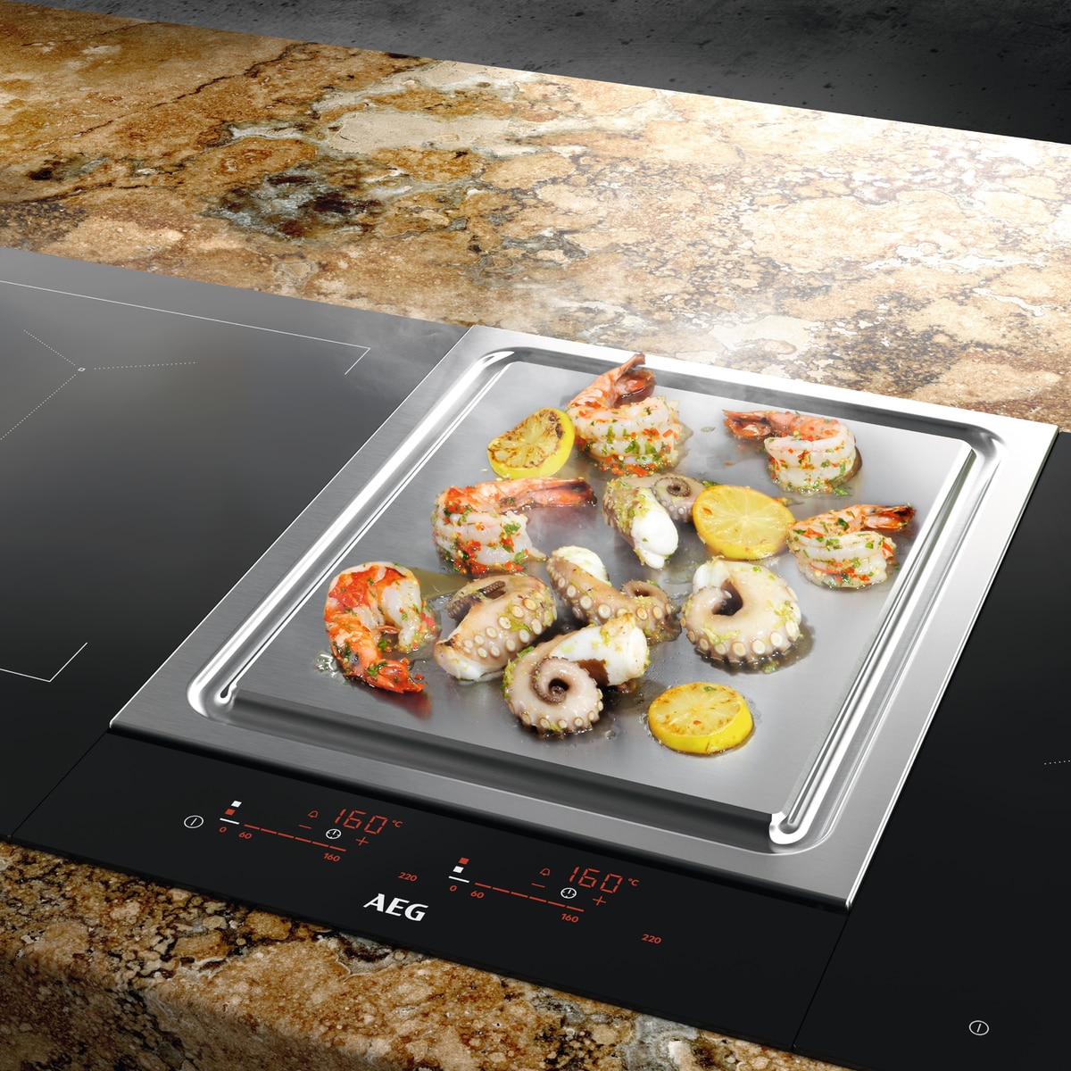 Placa modular de indução «Teppanyaki» de 36 cm e Inox con display de controlo táctil deslizante sobre superfície cerâmica e temporizador.