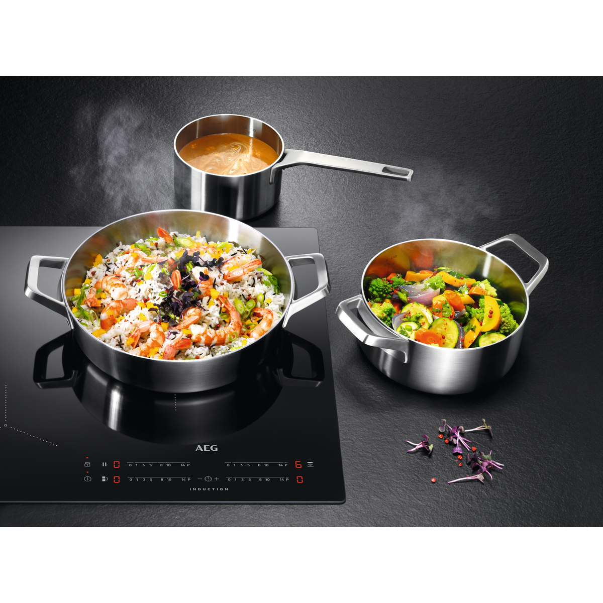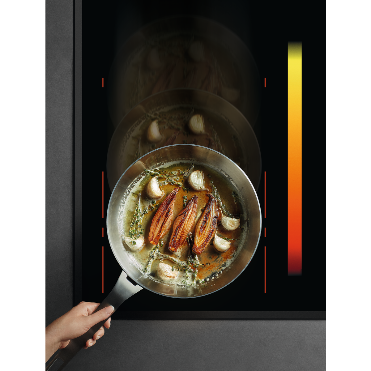Placa de indução da Série 6000 de 4 zonas e 80 cm, Função FlexiBridgee sistema PowerSlide, controlos deslizantes individuais (potência de 0 a 9 com 4 zonas PowerBoost) com temporizador individual para cada zona, função de pausa, bloqueio de segurança, conexão Hob2Hood com um exaustor compatível.