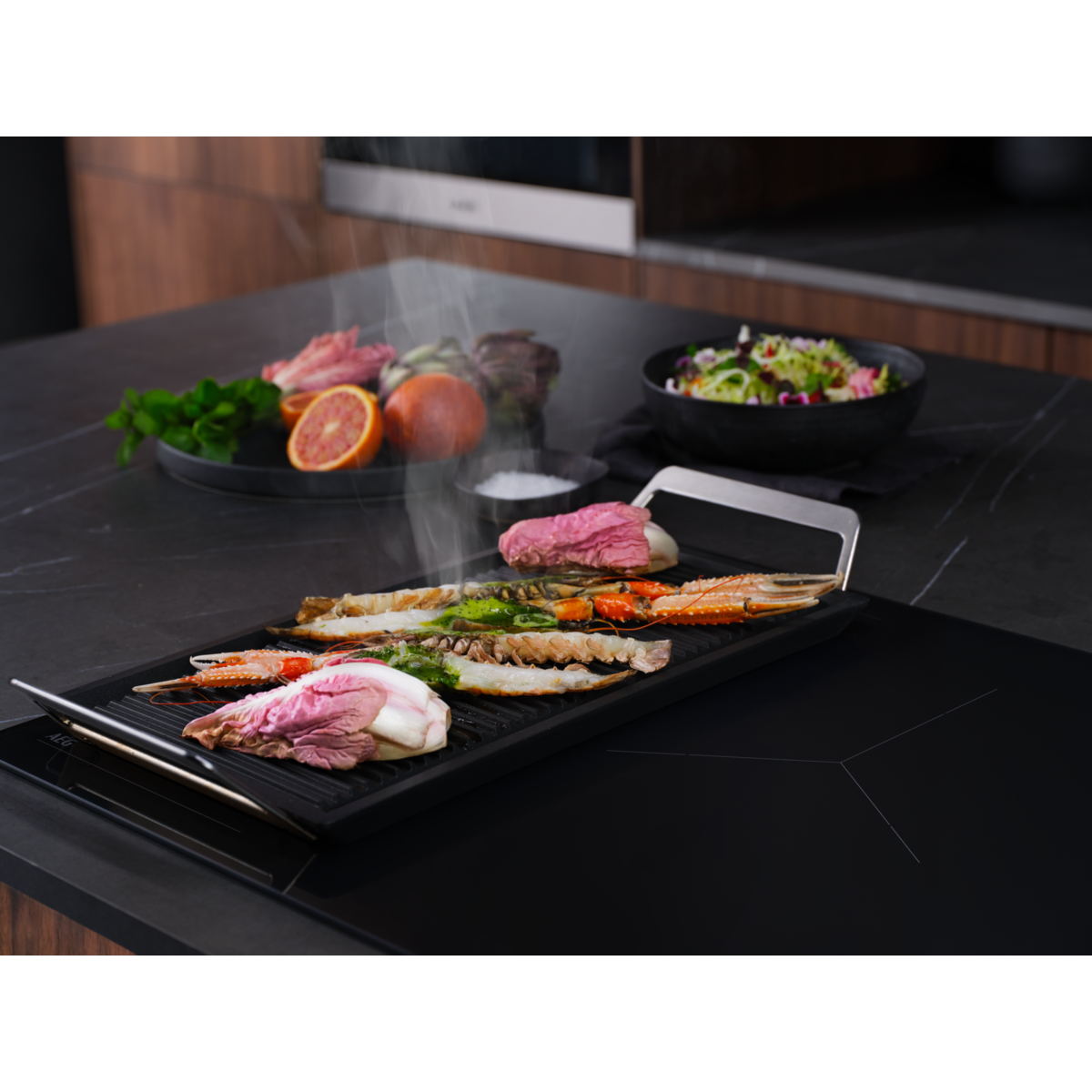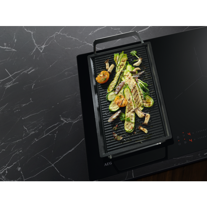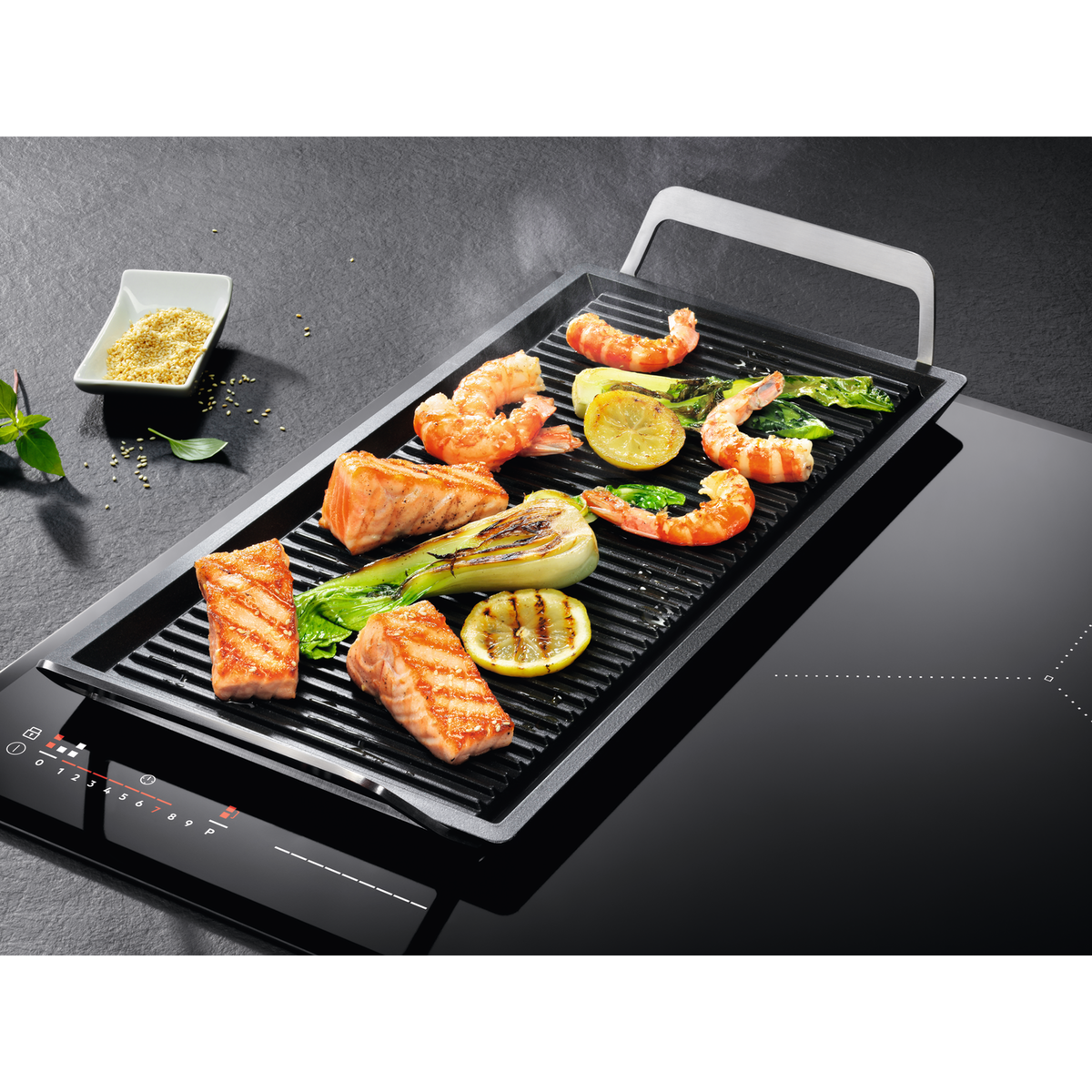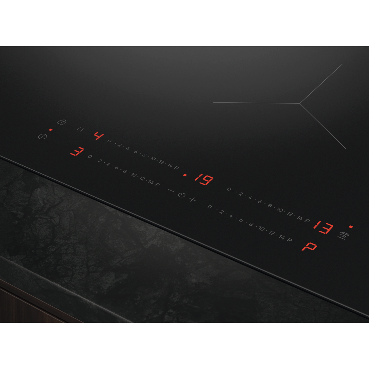 Placa de indução da Série 6000 de 60 cm com 4 zonas (2 x 21 cm, 18 cm e 14,5 cm), função Ponte, com controlos deslizantes individuais (0-14), 4 zonas PowerBoost e temporizador individual, função Pausa, bloqueio de segurança, ligação Hob2Hood para controlo automático de um exaustor compatível, duplo biselado nos lados