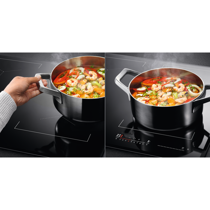 Placa de indução da Série 6000 TotalFlex de 60 cm com 4 zonas, função Ponte automática, reconhecimento automático de zona e Active Touch, com controlos deslizantes individuais (0-9), 4 zonas PowerBoost e temporizador individual, função Pausa, bloqueio de segurança, ligação Hob2Hood para controlo automático de um exaustor compatível, duplo biselado nos lados