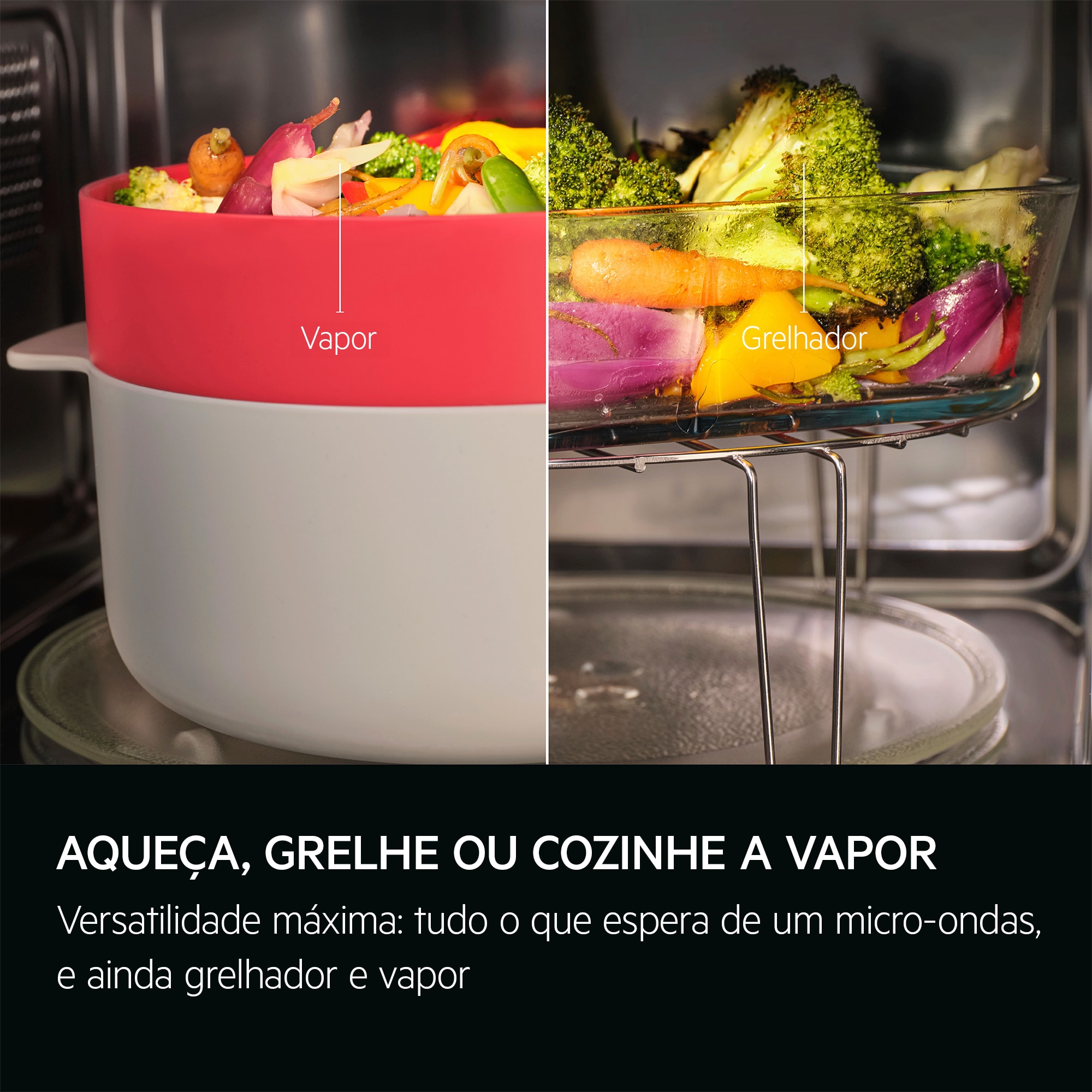 A rapidez de um micro-ondas com um acabamento perfeito de grelhador