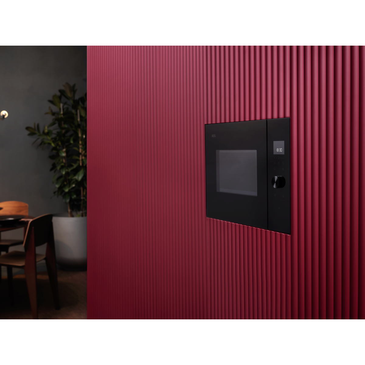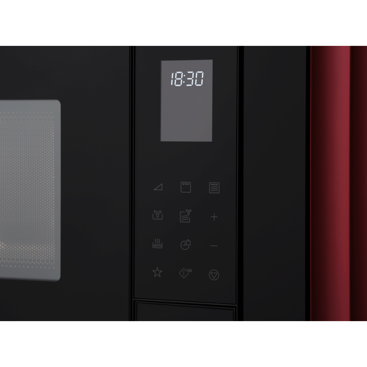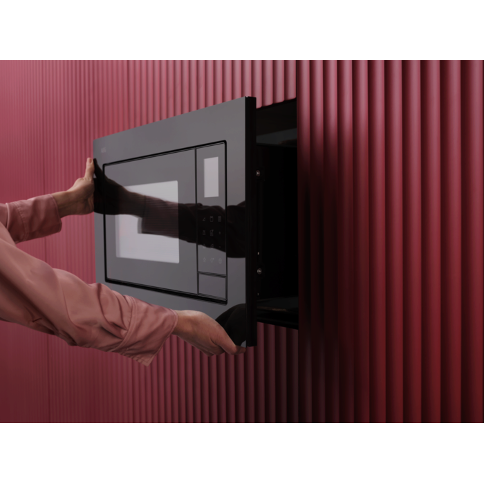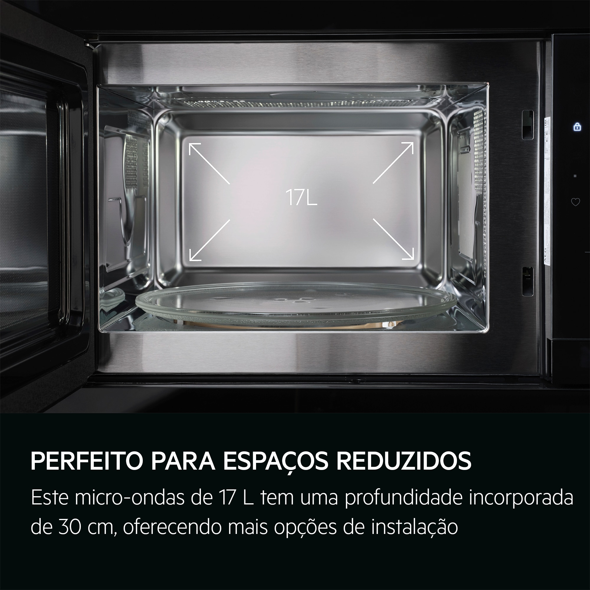 Micro-ondas da Série 6000 de integração total e 17 litros com display LED, painel tátil com programas de cozedura, micro-ondas de 800 W com grill de 800 W, abertura eletrónica, prato giratório de 27,2 cm de diâmetro, kit de cozedura a vapor, moldura integrada, vidro preto