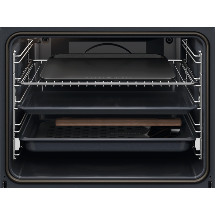 Forno pirolítico multifunções da Série 7000 MealAssist PizzaExpert com display tátil Excite com Wi‑Fi, de 60 cm e 72 litros, 16 programas + 99 receitas pré‑programadas, calhas telescópicas num nível, fecho suave da porta com 4 vidros, vidro Preto e puxador preto anodizado
