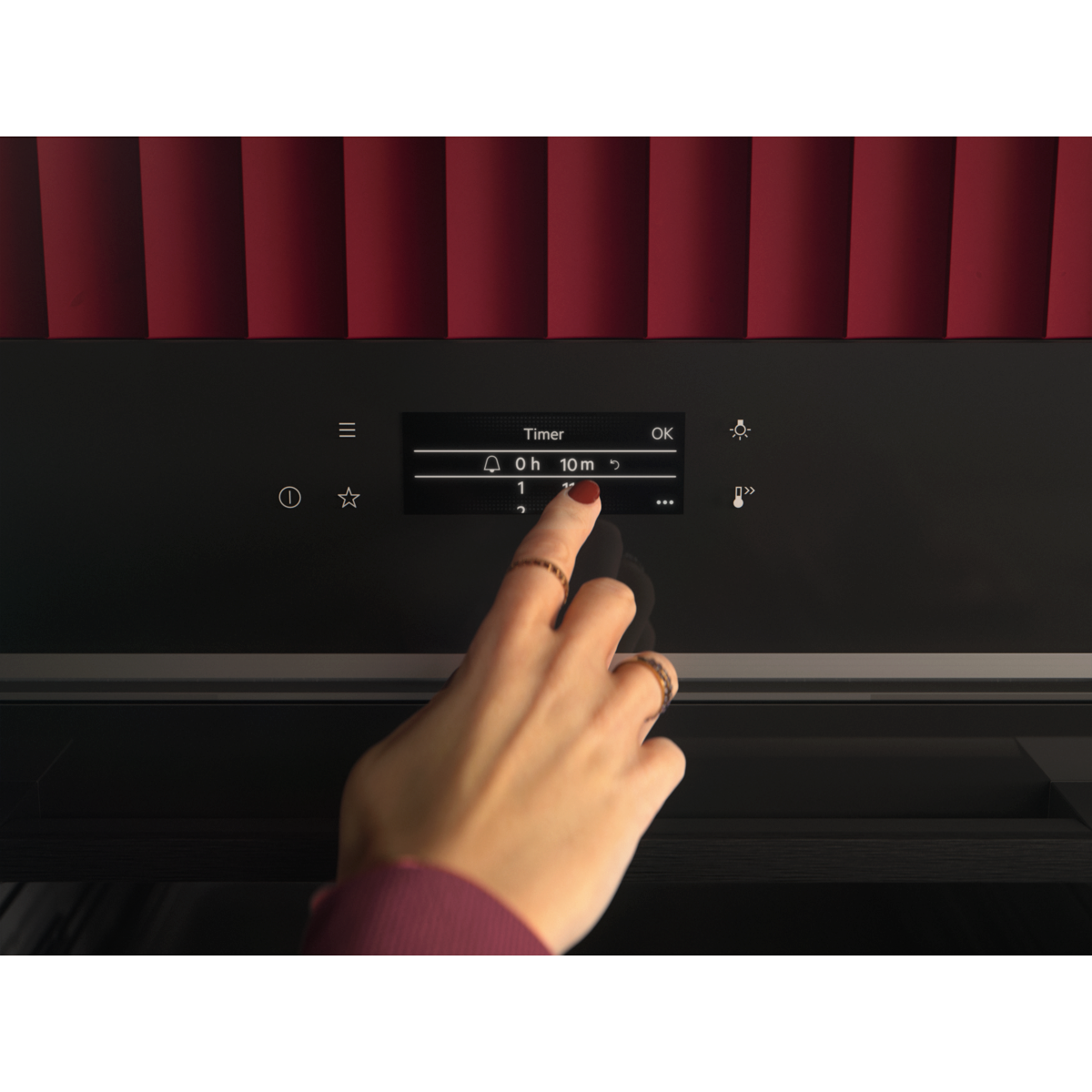 Forno pirolítico multifunções da Série 7000 MealAssist com Display tátil Excite com WiFi, capacidade de 71 litros, 16 funções e 160 programas automáticos, sonda térmica, calhas telescópicas num nível, abertura e fecho suave da porta com 4 vidros, vidro preto com perfil Inox Infinity e puxador preto anodizado