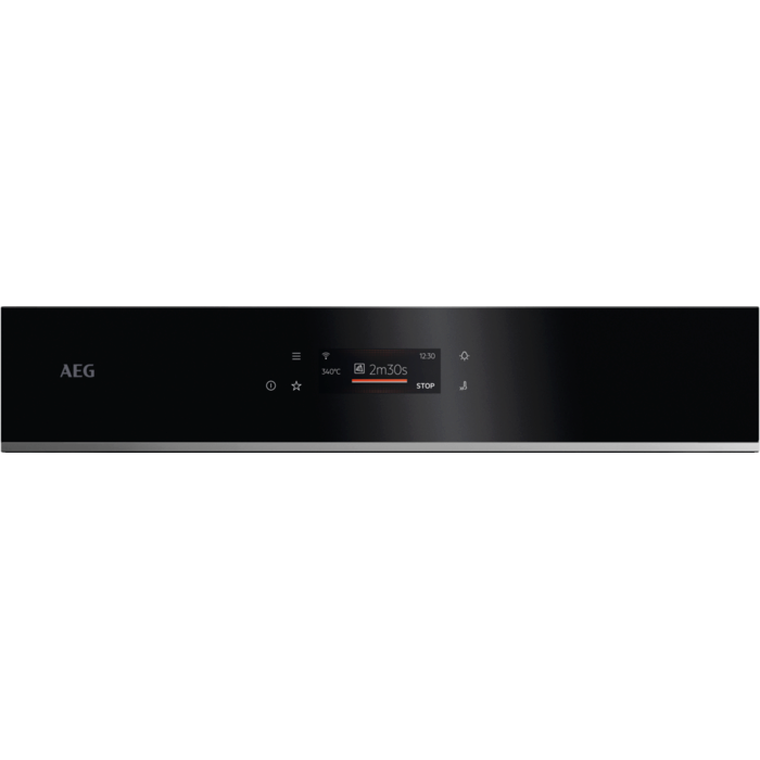 Forno pirolítico multifunções da Série 7000 MealAssist PizzaExpert com display tátil Excite com Wi‑Fi, de 60 cm e 72 litros, 16 programas + 99 receitas pré‑programadas, calhas telescópicas num nível, fecho suave da porta com 4 vidros, vidro Preto com perfil Inox Infinity e puxador preto anodizado