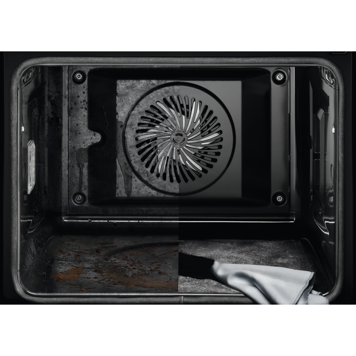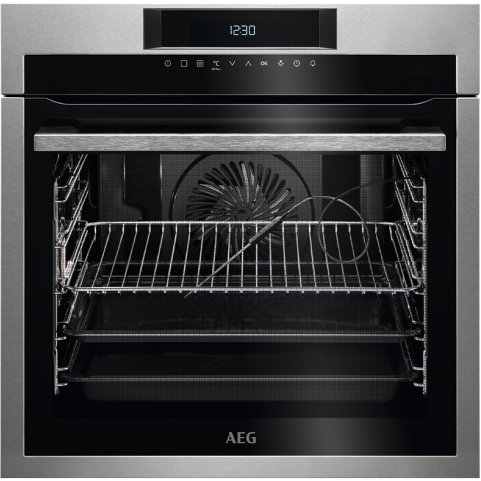 Forno Pirolítico SenseCook com sonda térmica, 12 funções de aquecimento, limpeza por pirólise, display tátil, 4 vidros na porta, calhas telescópicas de 1 nível, INOX Anti dedadas, classe A+.