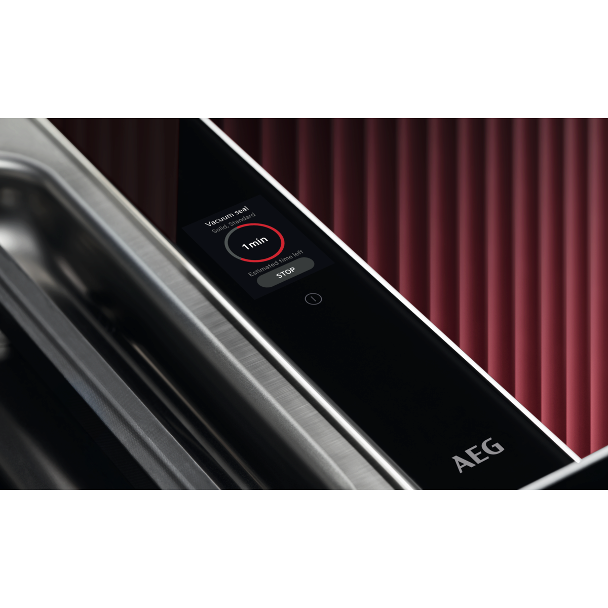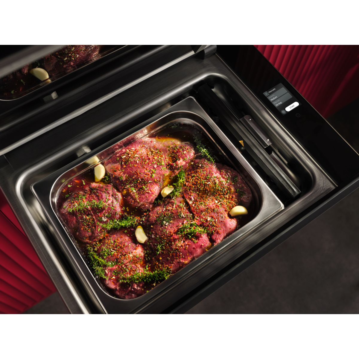Gaveta de vácuo integrável de 14 cm de altura com display tátil TFT com abertura «Push», embalar a vácuo, selar, limpar marisco de concha, vácuo externo, desidratar, marinar, encurtir, infusionar, amaciar, conservar óleos, tempo de selagem regulável, favoritos, programas recentes, preto mate