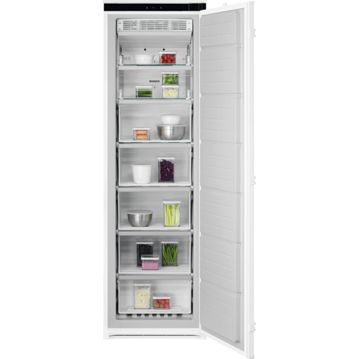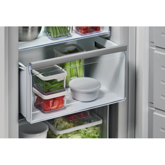 Arca vertical integrável Série 7000 No Frost, 1,77 m x 54,6 cm, display eletrónico LED, 5 gavetas + 2 portas basculantes, técnica de arraste, compressor Inverter, interiores fabricados com material reciclado. Instalação rápida, possibilidade de instalação em conjunto com NSK6D181ES.