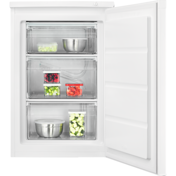 Arca vertical de 84,5x56x57,5 cm, controlo eletromecânico, porta plana, branca, classe E, instalação debaixo de bancada