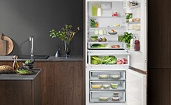 Os combinados de encastrar AEG pertencem à nova geração de eletrodomésticos em que a tecnologia e o design provocaram uma mudança significativa na economia de espaço e na eficiência energética. O fluxo de ar constante do sistema DynamicAir permite manter uma temperatura uniforme e, assim, reduzir drasticamente o nível de consumo de eletricidade, enquanto o degelo automático e as propriedades NoFrost reduzem a formação de gelo no congelador. Com os combinados integrados, não terá que decidir entre espaço, design e as tecnologias mais recentes; pode ter tudo num só produto.