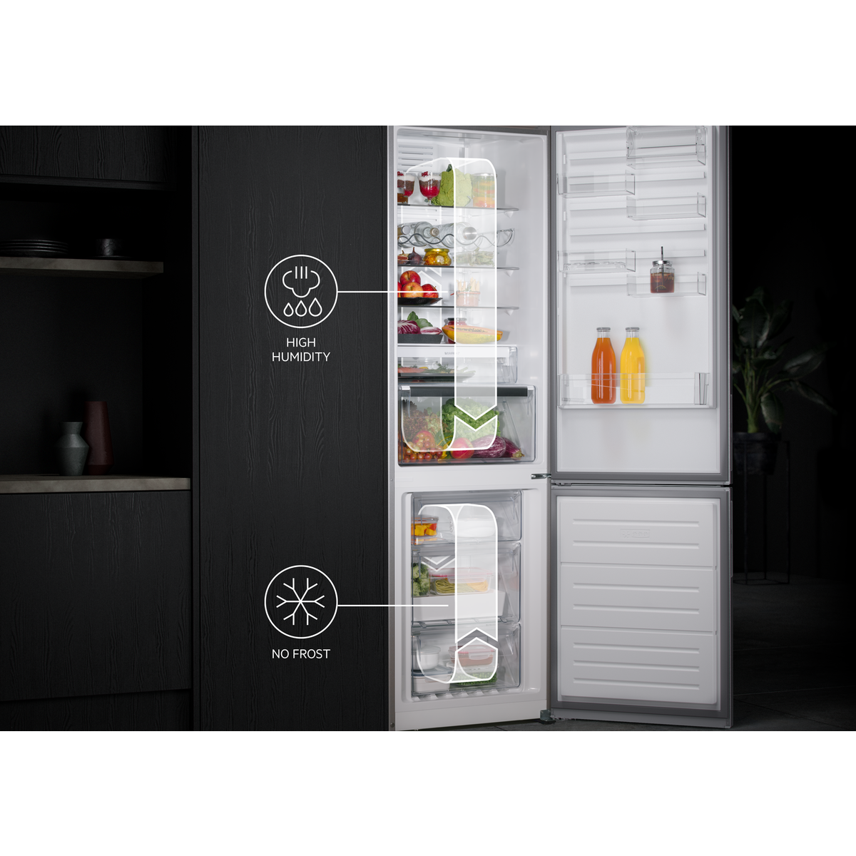Frigorífico combinado da Série 6000 Twintech® No Frost, com dimensões de 177,2 cm x 54,6 cm, TwinTech: Total No Frost Multiflow, display LED com Ecometer, gaveta Maxibox+ Extrachill, instalação com técnica de arraste, compressor Inverter, luzes LED, interiores fabricados com material reciclado, instalação rápida, branco