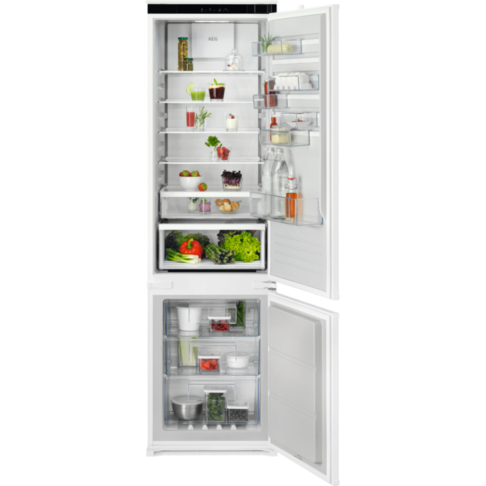 Frigorífico combinado da Série 6000 Twintech® No Frost, com dimensões de 188,4 cm x 54,8 cm, TwinTech: Total No Frost Multiflow, Customflex, display LED com Ecometer, gaveta Maxibox+ Extrachill, instalação com técnica de arraste, compressor Inverter, luzes LED, interiores fabricados com material reciclado, instalação rápida, branco
