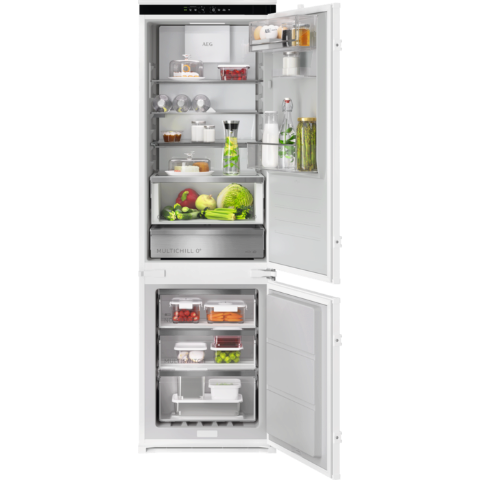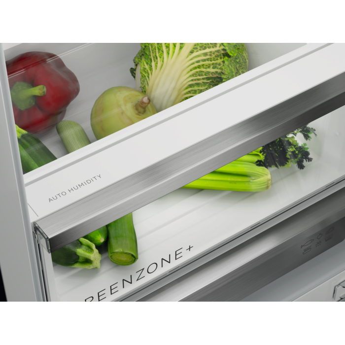 Combinado da Série 9000 MultiChill 0°, com 177,2 cm x 55,7 cm, com tecnologia TwinTech Total No Frost, barra Multiflow em vidro, display digital com Ecometer, gaveta GreenZone+, congelador convertível em frigorífico, compressor Inverter, interiores fabricados com materiais reciclados, iluminação LED e instalação rápida.