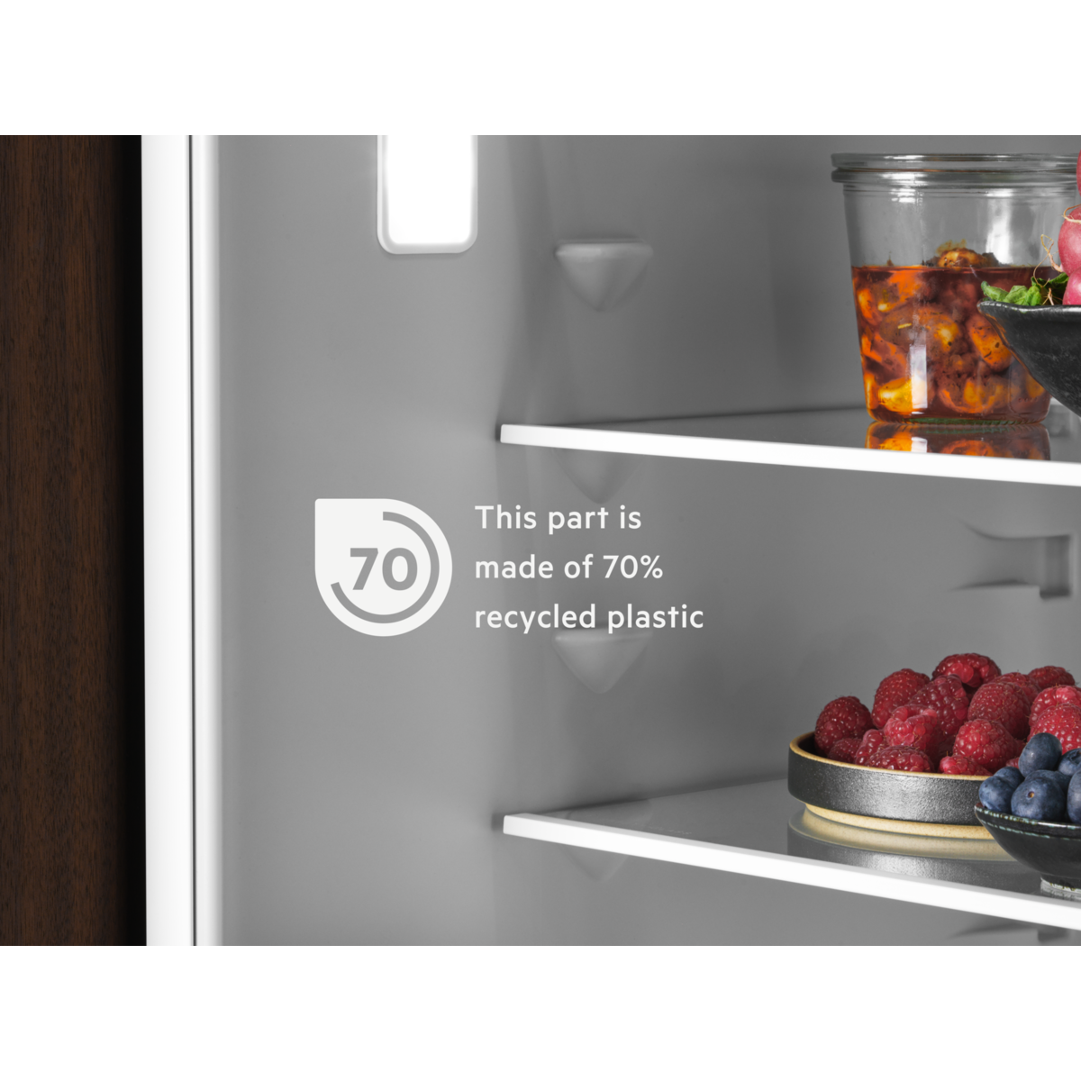 Revestimento interno rHIPS feito com até 70% de plástico reciclado, representando 13% do plástico total do frigorífico.