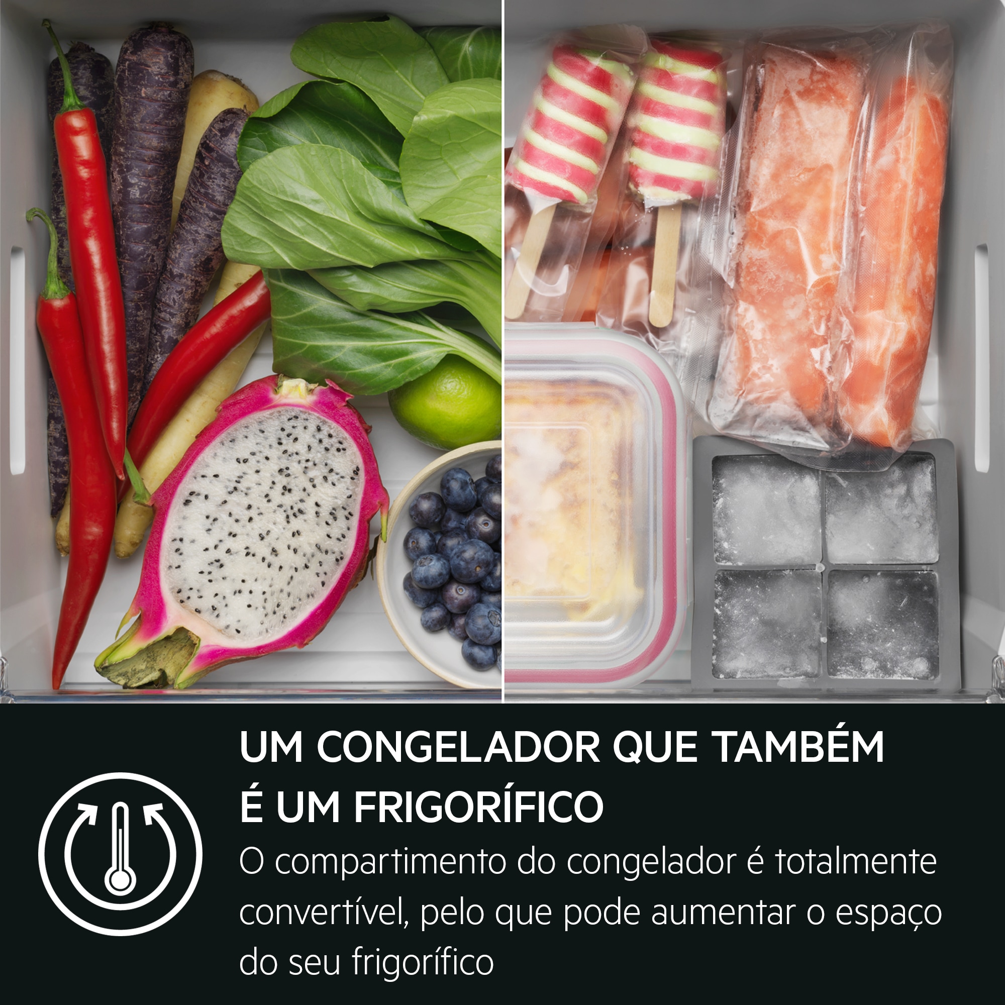 O espaço do congelador converte-se em frigorífico. Para maior flexibilidade