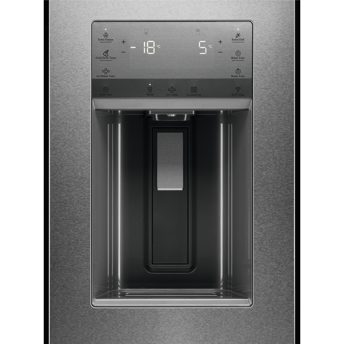 Combinado da Série 9000 MultiSwitch de 178,2 cm, NoFrost Multiflow, Display LCD na porta, Porta CustomFlex, gaveta ajustável (-18°C +7°C), Dispensador de água e gelo, Portas planas em aço inoxidável