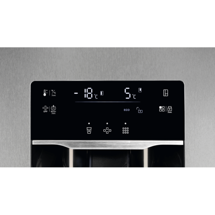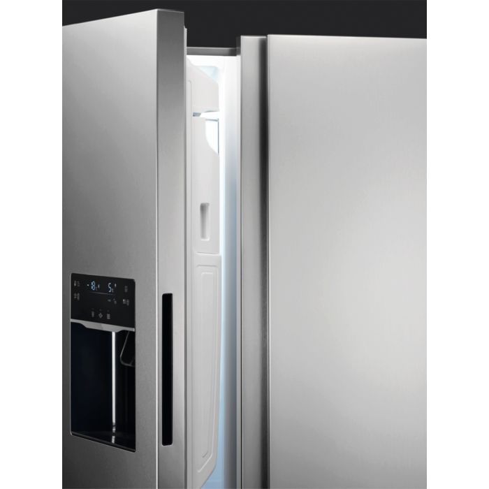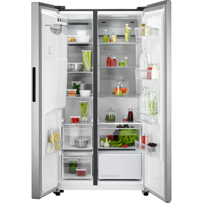 Side-by-Side Série 9000 MultiChill 0° de 177 cm, 593 l, Look INOX, dispensador de agua e gelo, No-Frost Multiflow, Cooling 360º, display na porta, gaveta Multichill 0ºC, gaveta Freshzone com controlo de humidade, compressor Inverter