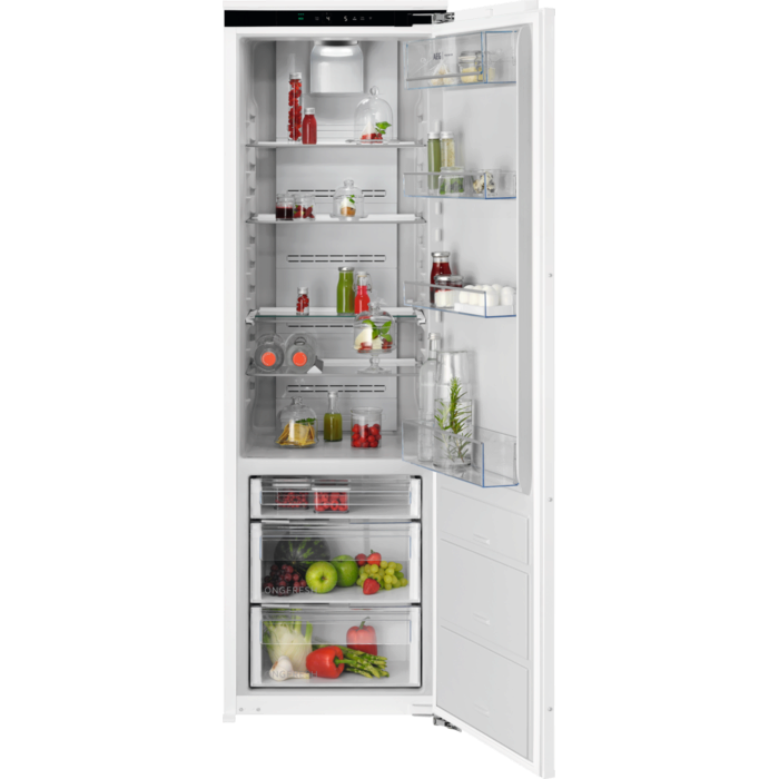 Frigorífico de uma porta integrável da Série 9000 LongFresh MultiFlow de 1,77 m x 55,7 cm, display digital com Ecometer, 3 gavetas a 0°C, instalação porta sobre porta, luzes LED, filtro antiodores, fecho suave da porta, interiores fabricados com material reciclado, instalação rápida, possibilidade de instalação em conjunto com PCA7000F