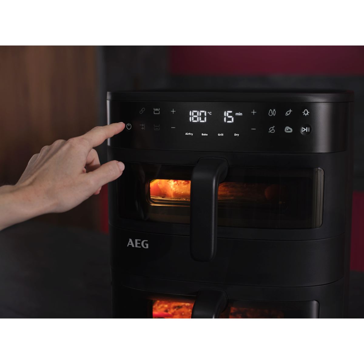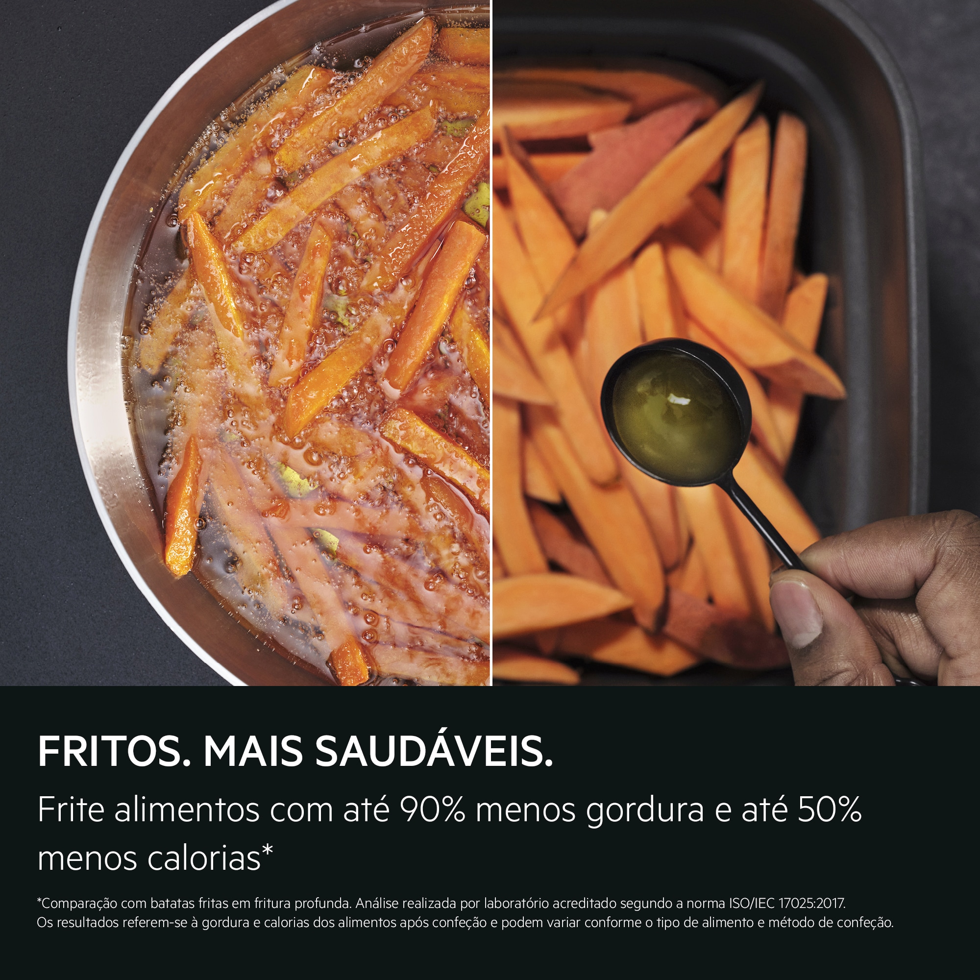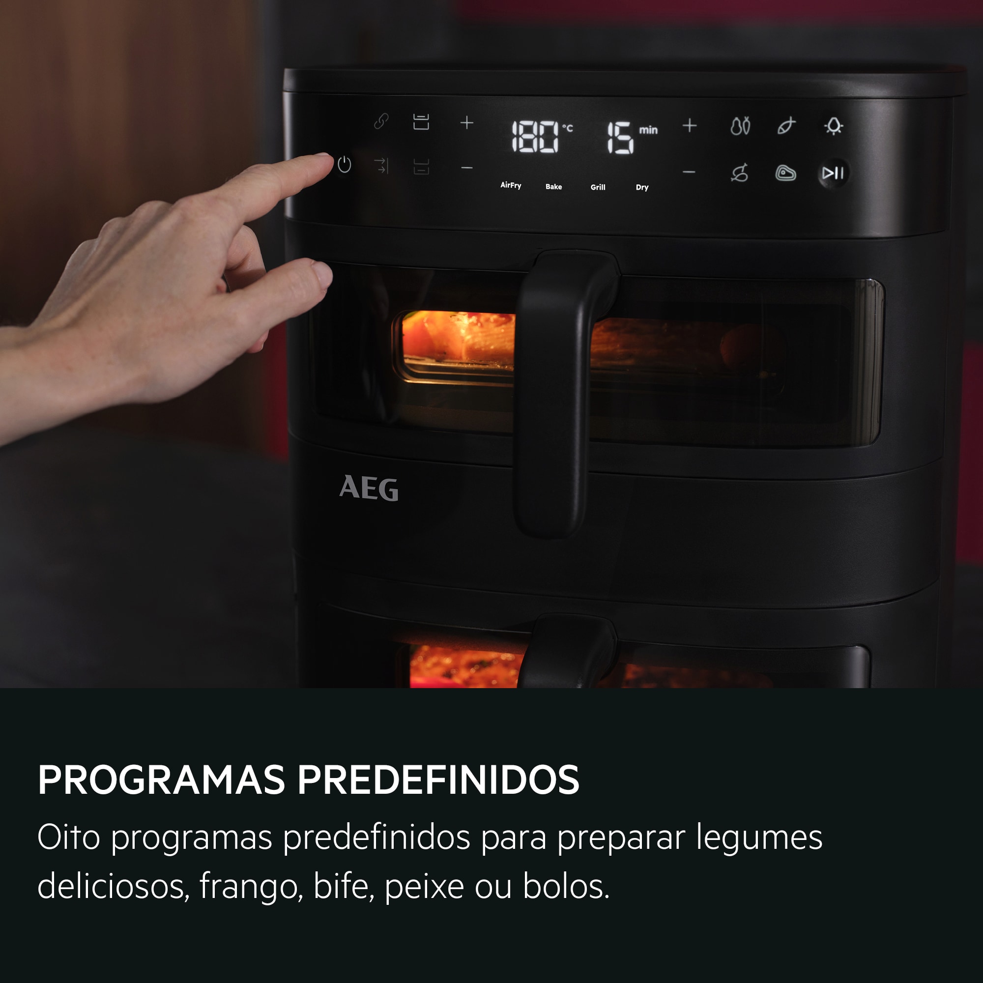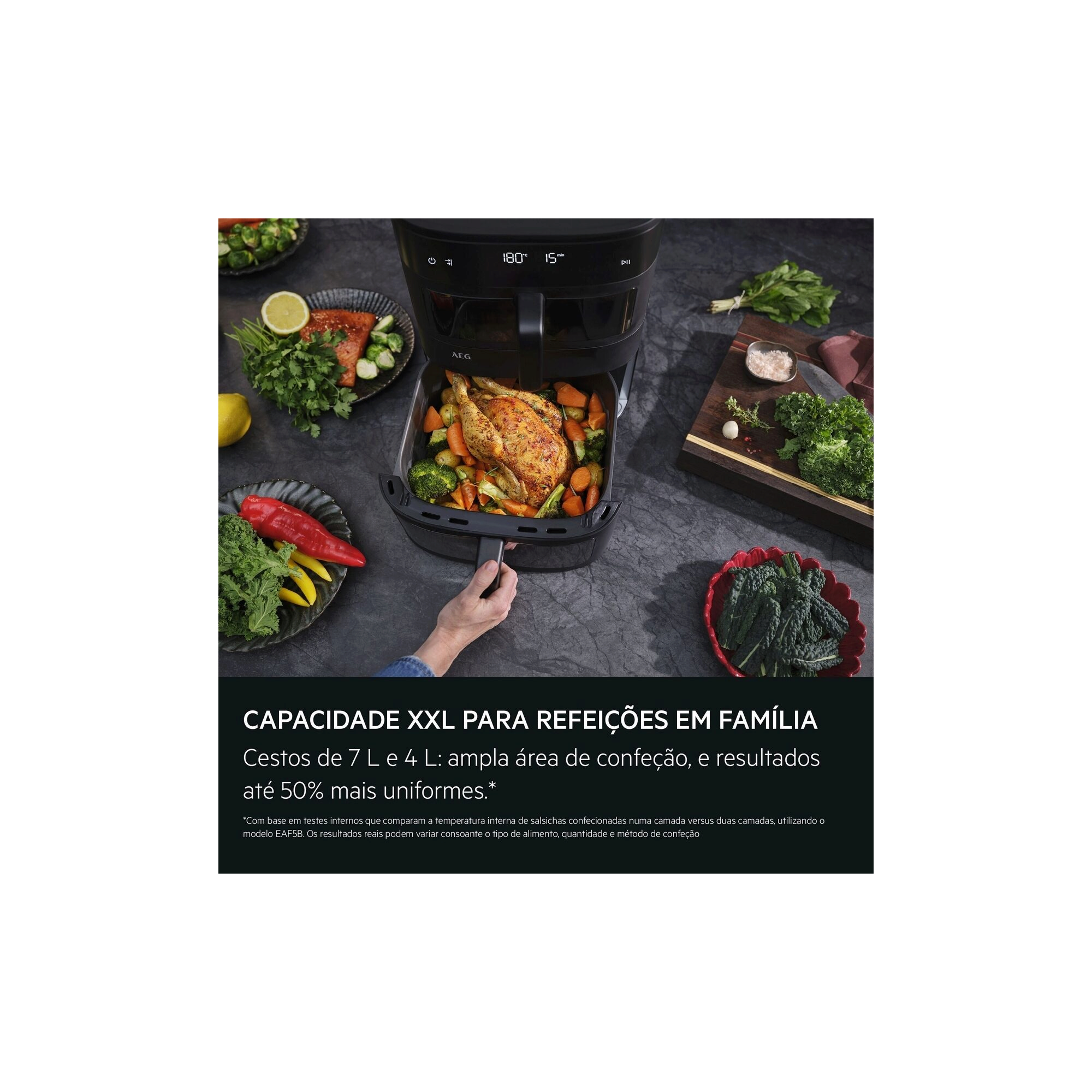 **Com base em testes internos comparando a temperatura interna de salsichas cozinhadas numa camada versus duas camadas utilizando o modelo EAF5B. Os resultados reais podem variar consoante o tipo de alimento, quantidade e método de confeção.
