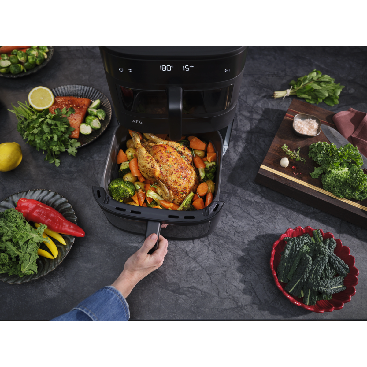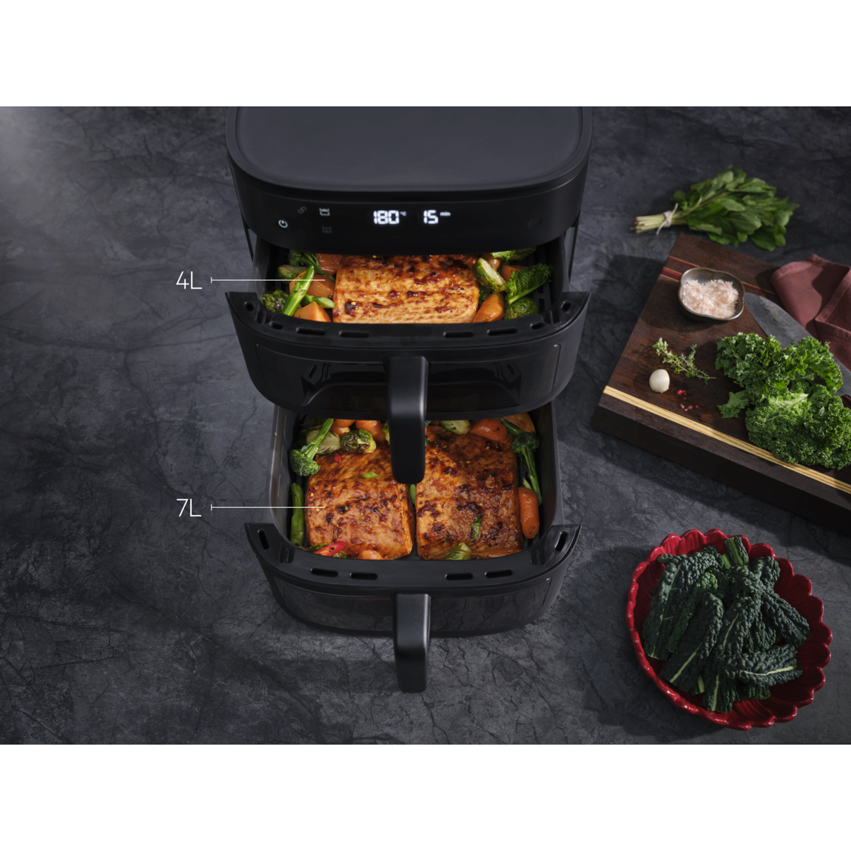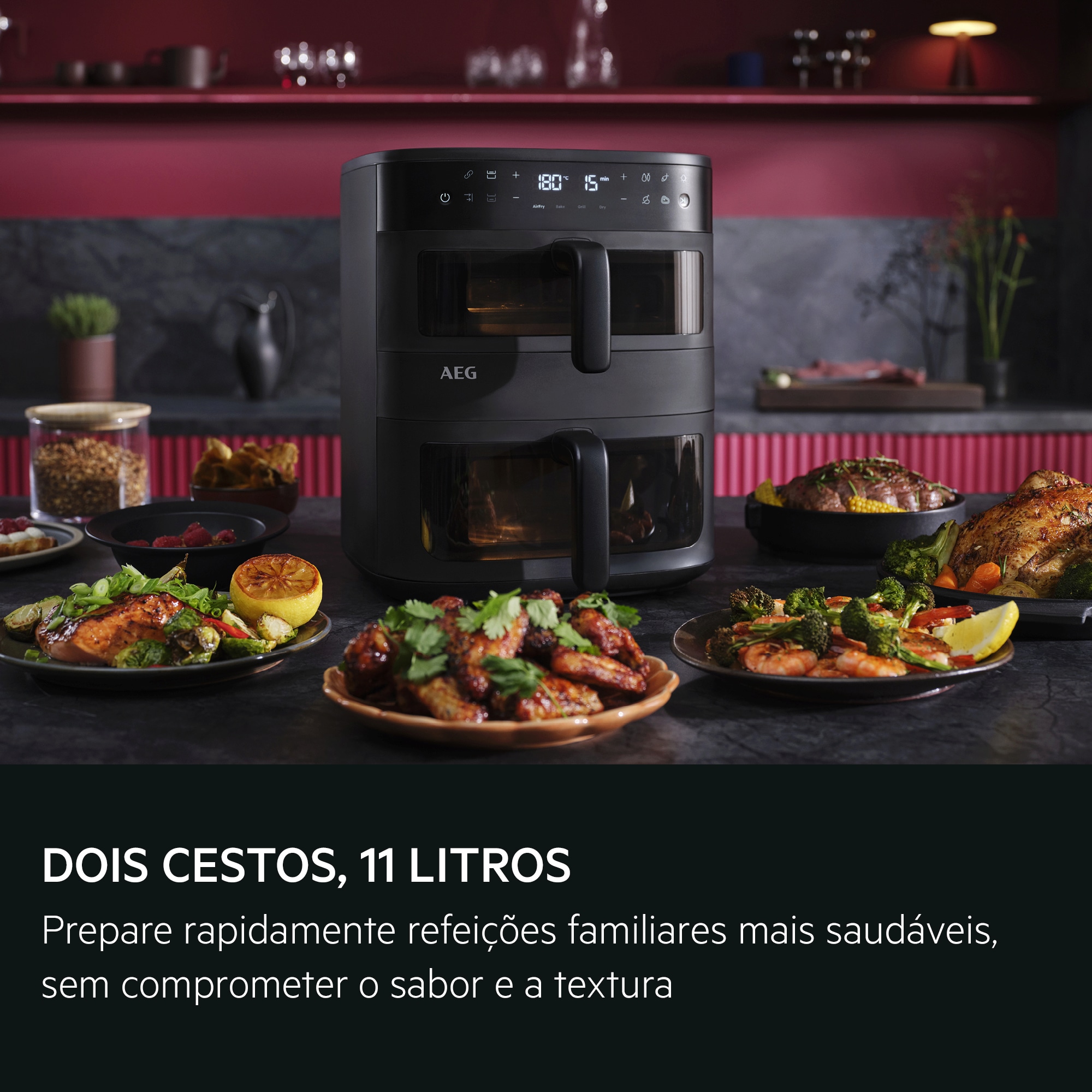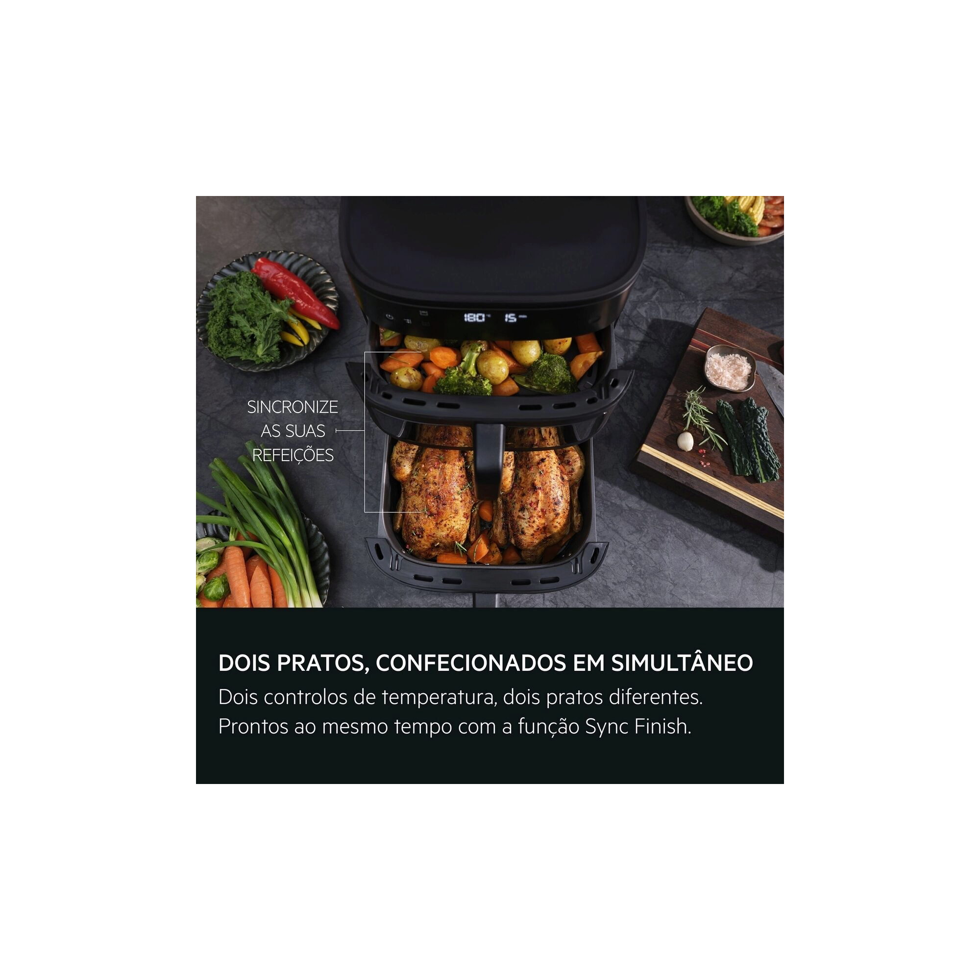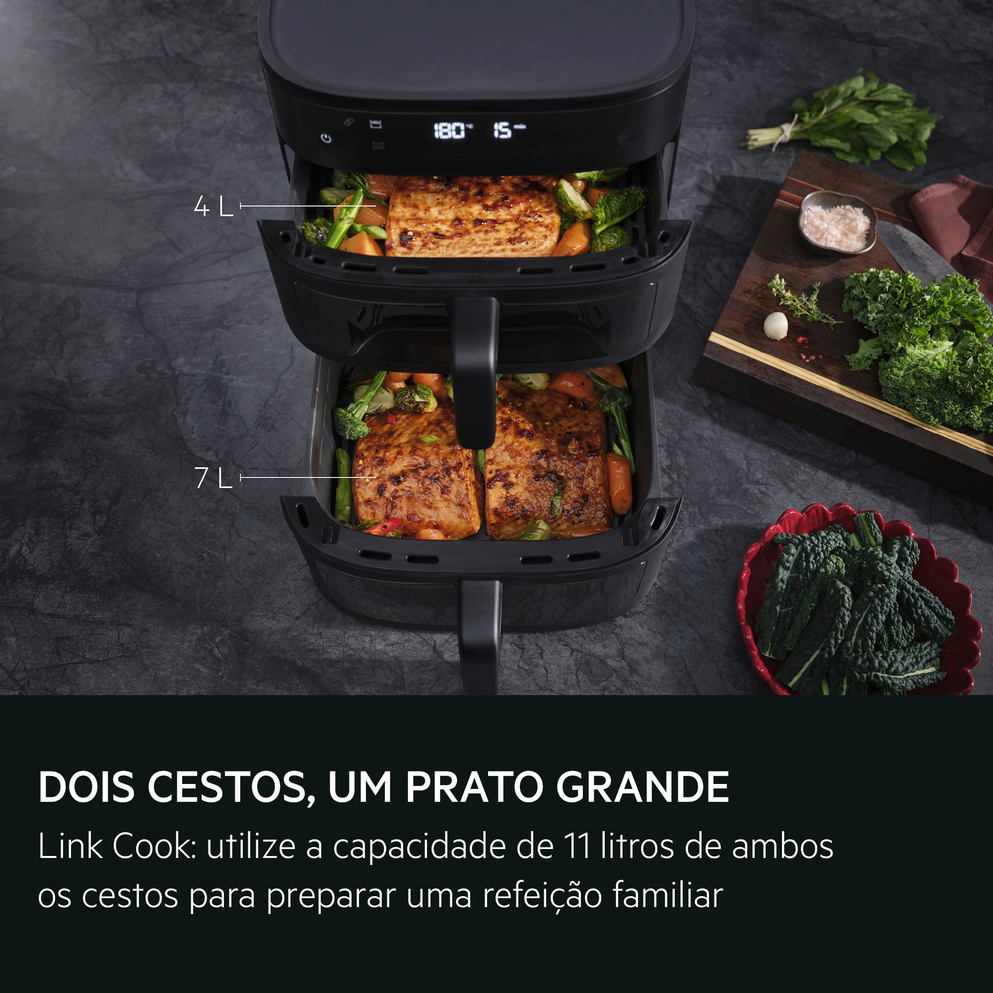 Mais capacidade, sem comprometer o desempenho. Preparar uma refeição saudável rapidamente para toda a família nunca foi tão fácil. O sistema de duas cestas permite cozinhar refeições familiares sem sacrificar o sabor ou a textura.