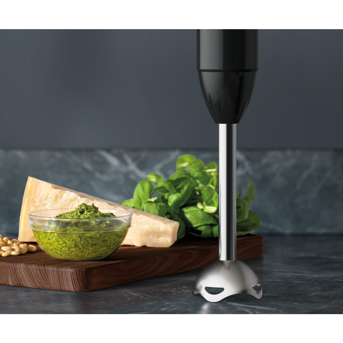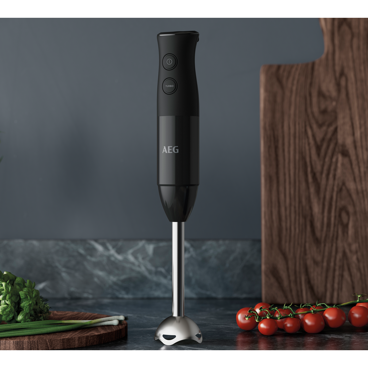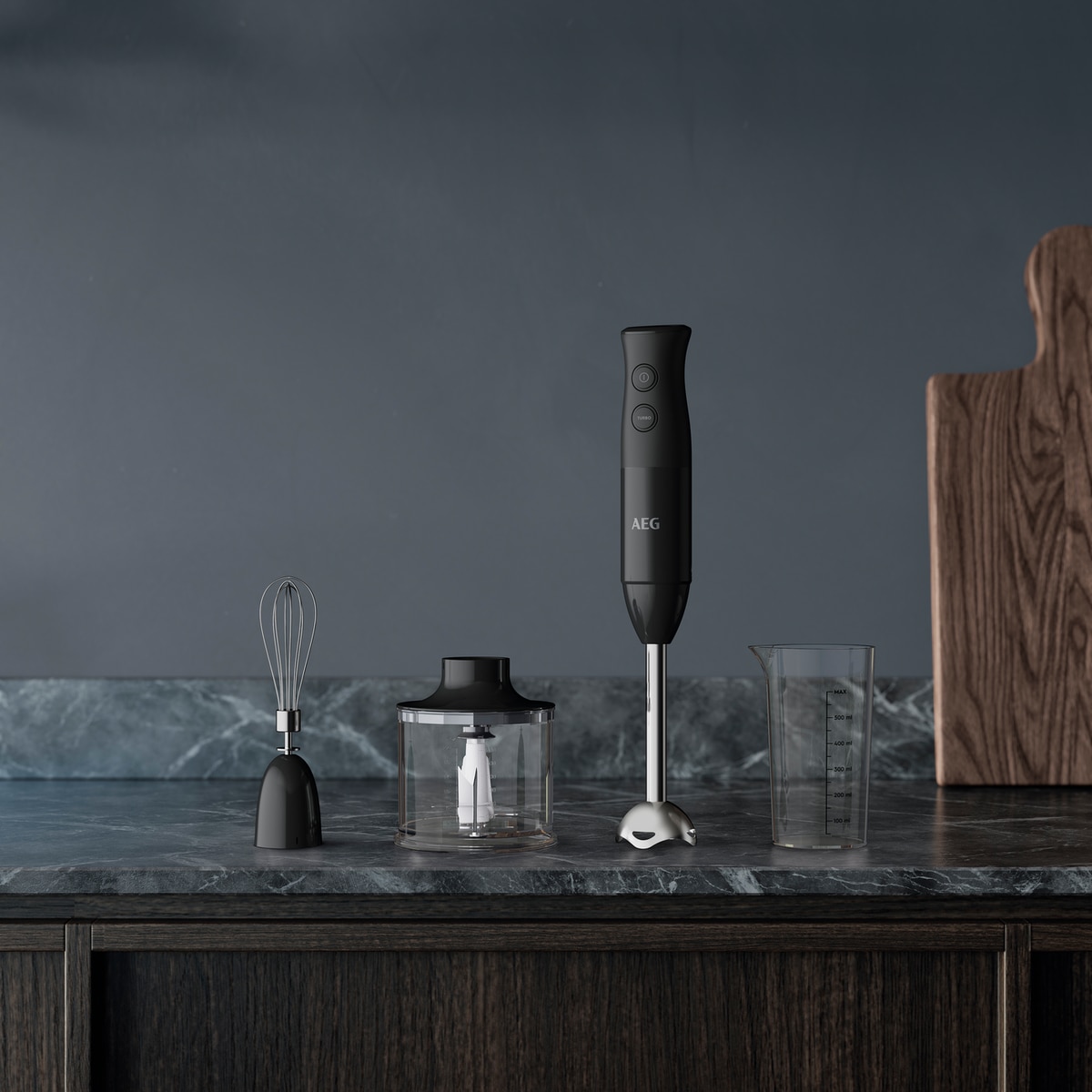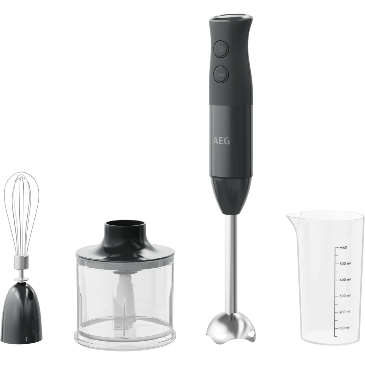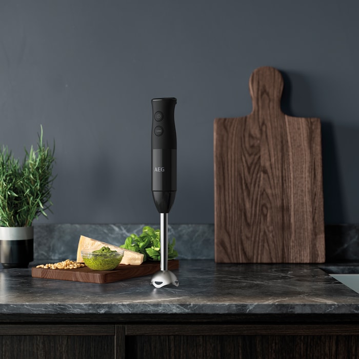 VArinha AEG HB4-1-6GG com 600 W de potência, lâmina dupla revestida a titânio, função Turbo, Acessórios: Mini picadora, braço batedor e tigela de 0,7 litro, cabo de 1 m, sem BPA. Preto