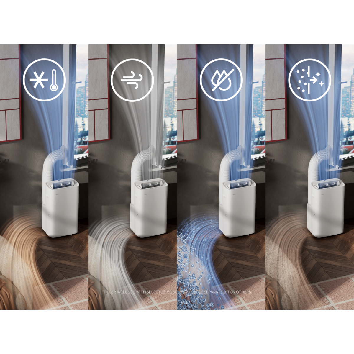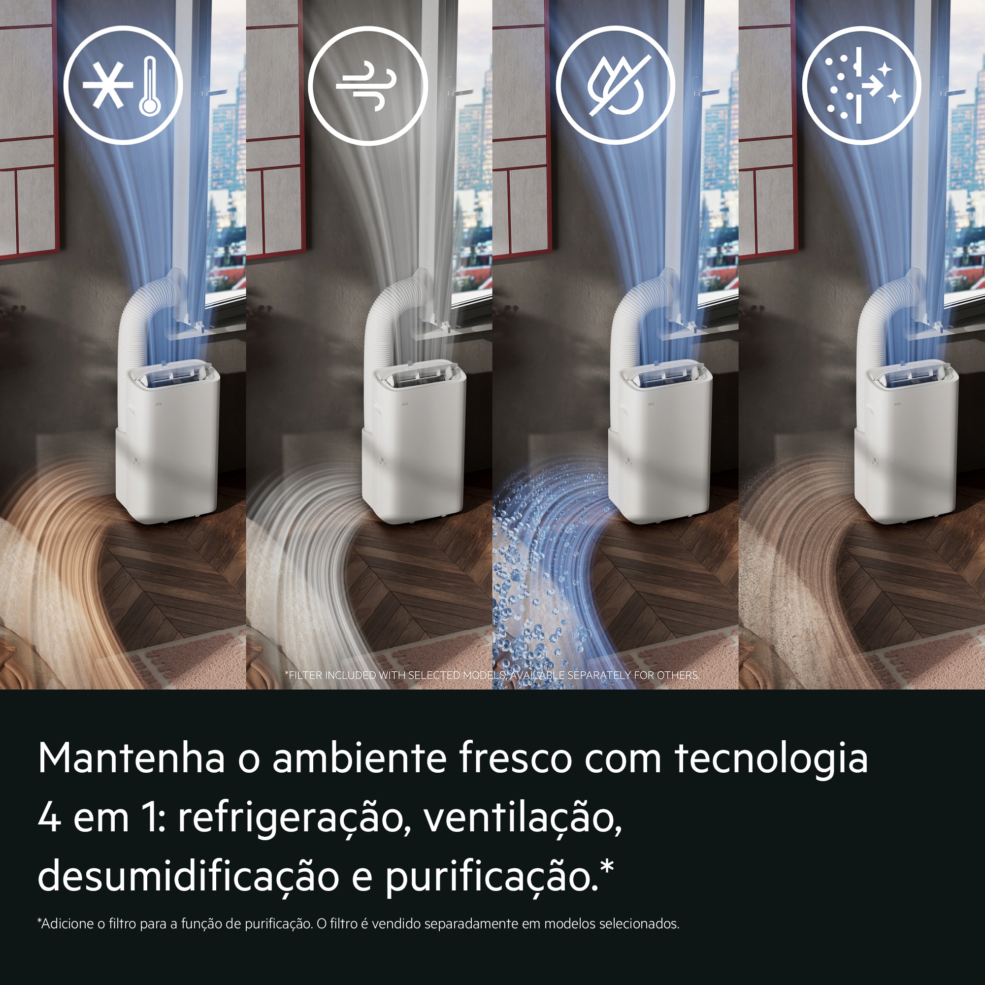 Ar condicionado portátil Série 7000, classe energética A+ no modo de arrefecimento, 4 modos de funcionamento (arrefecimento, desumidificação, ventilação e purificação), 12.000 BTU, ligação Bluetooth e Wi‑Fi, nível sonoro máximo de 64 dB(A), gás R290
