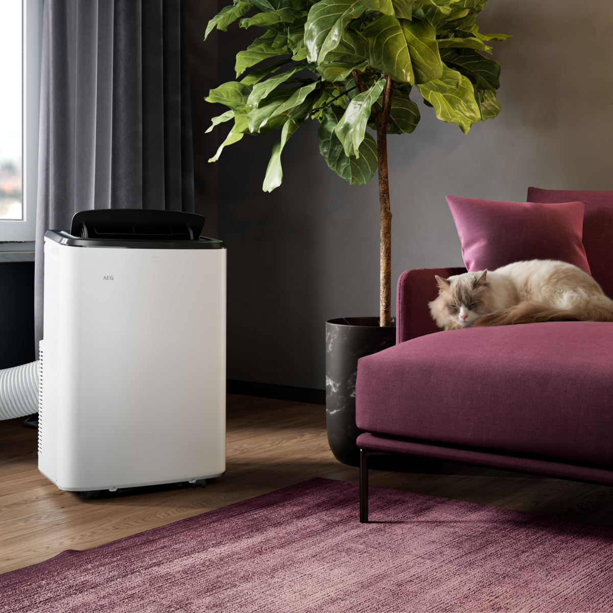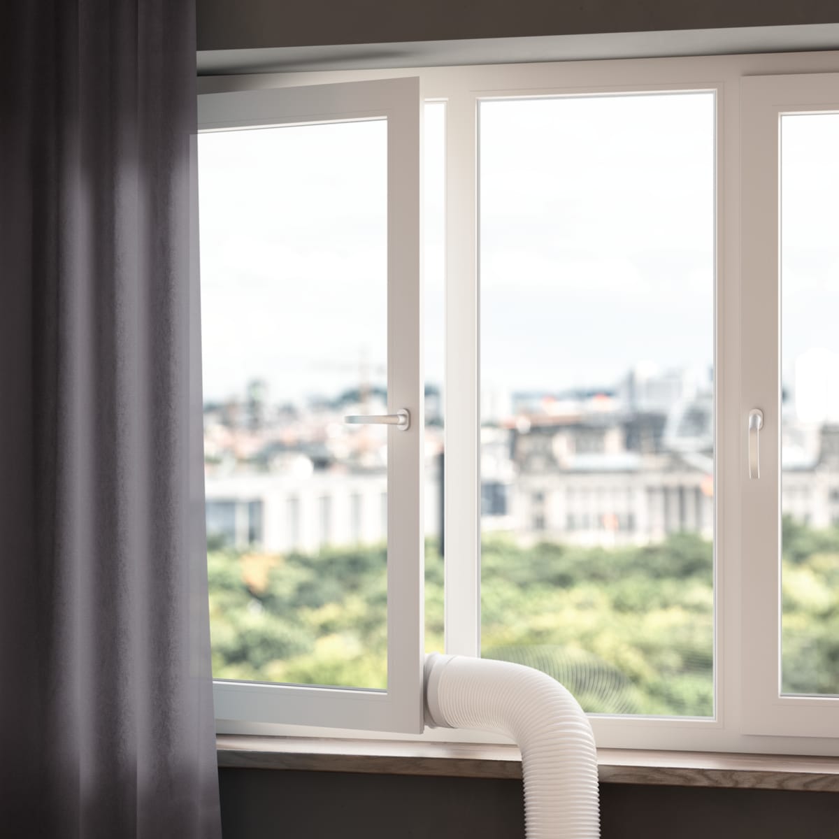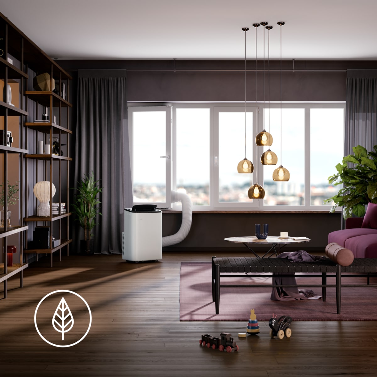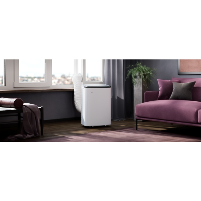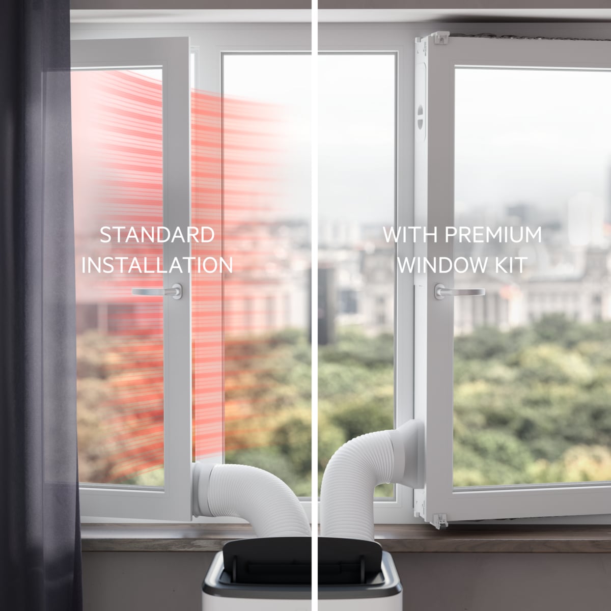 ²T° ambiente de 26 °C e T° definida de 24 °C: a T° definida é alcançada em 18 min com o kit de janela Premium e, num espaço sem kit de janela, em 22 min. Teste interno num espaço de 14 m², com humidade relativa de 60% e T° exterior de 30 °C.