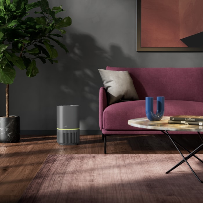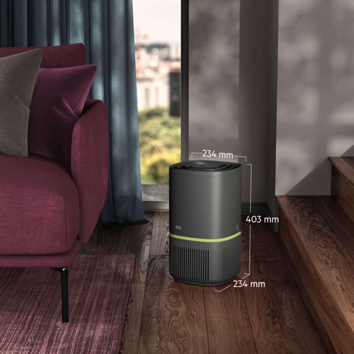 Purificador de ar AEG com capacidade para cobrir uma área de 41 m2 (Boverket) / 16 m2 (AHAM), 200 CADR (AHAM) Sensores de micropartículas, Nível de ruido máx. de 39 dB(A), 3 velocidades, interface tátil