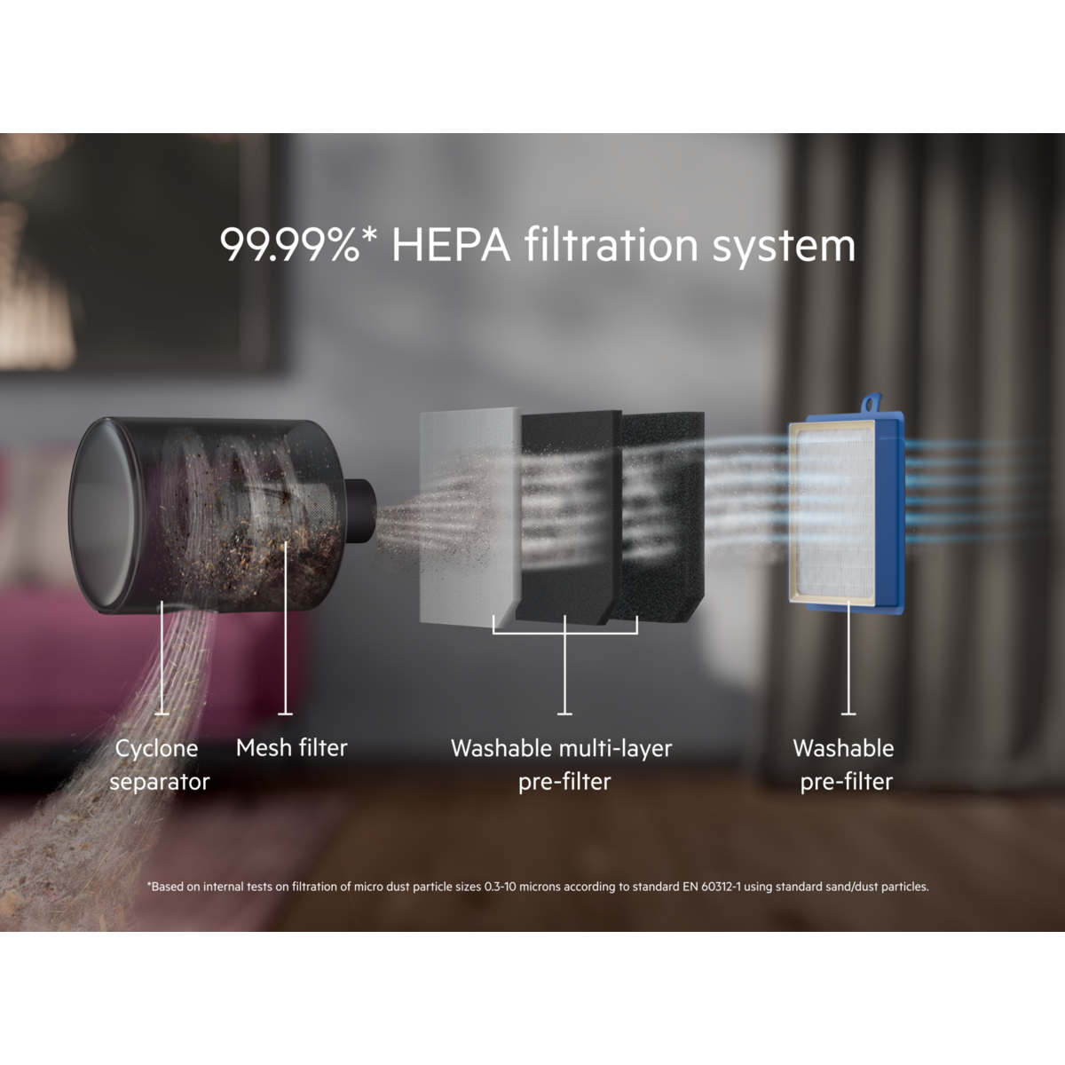 *Com base em testes internos de filtragem de micropartículas de pó com tamanhos entre 0,3-10 micrómetros, de acordo com a norma EN 60312-1 utilizando partículas de areia/pó normais.