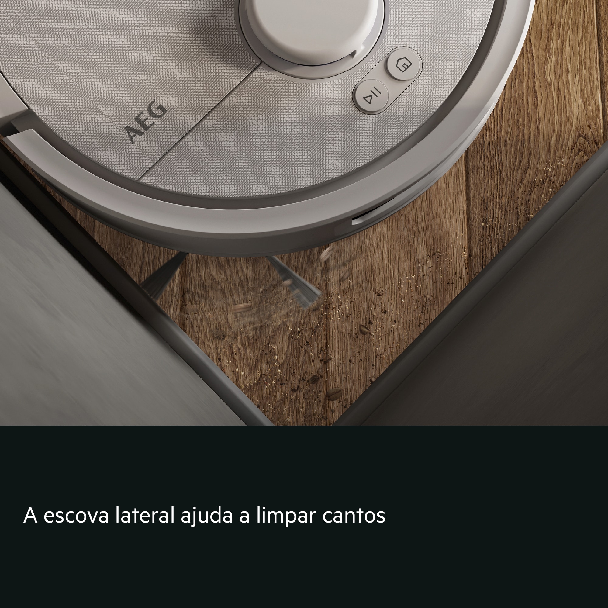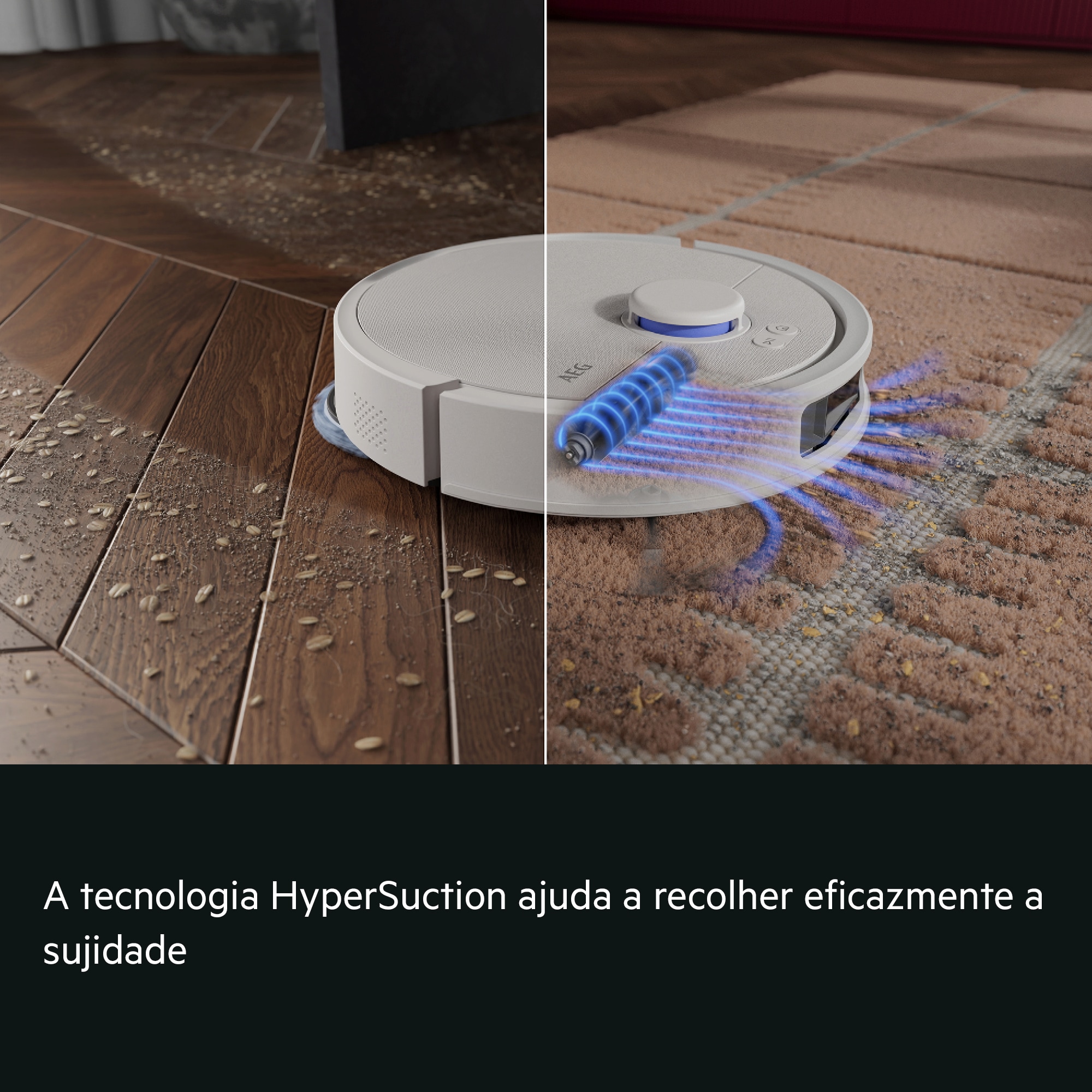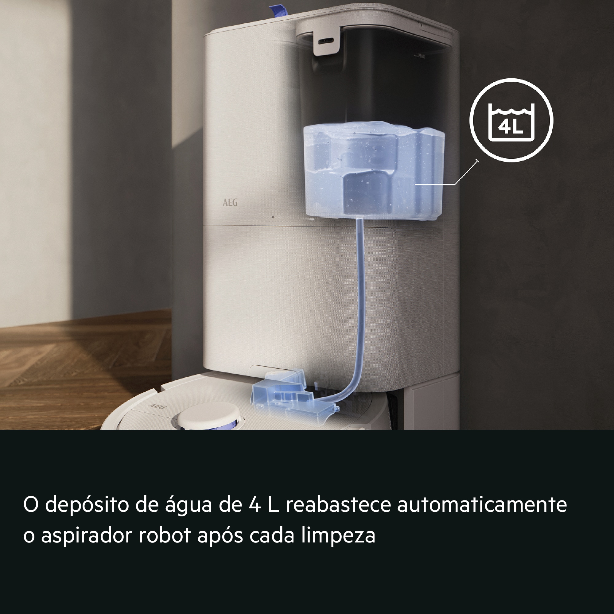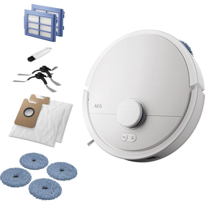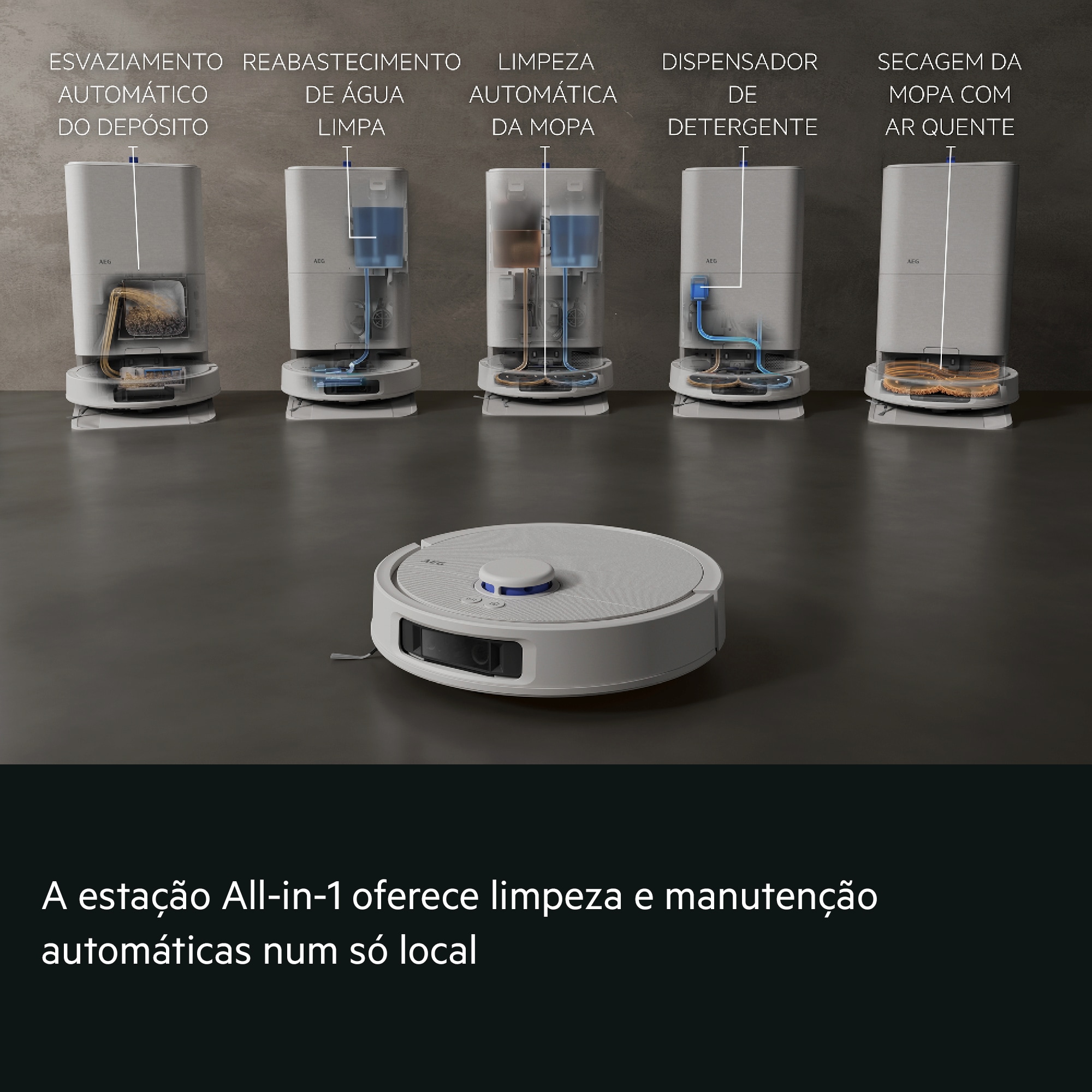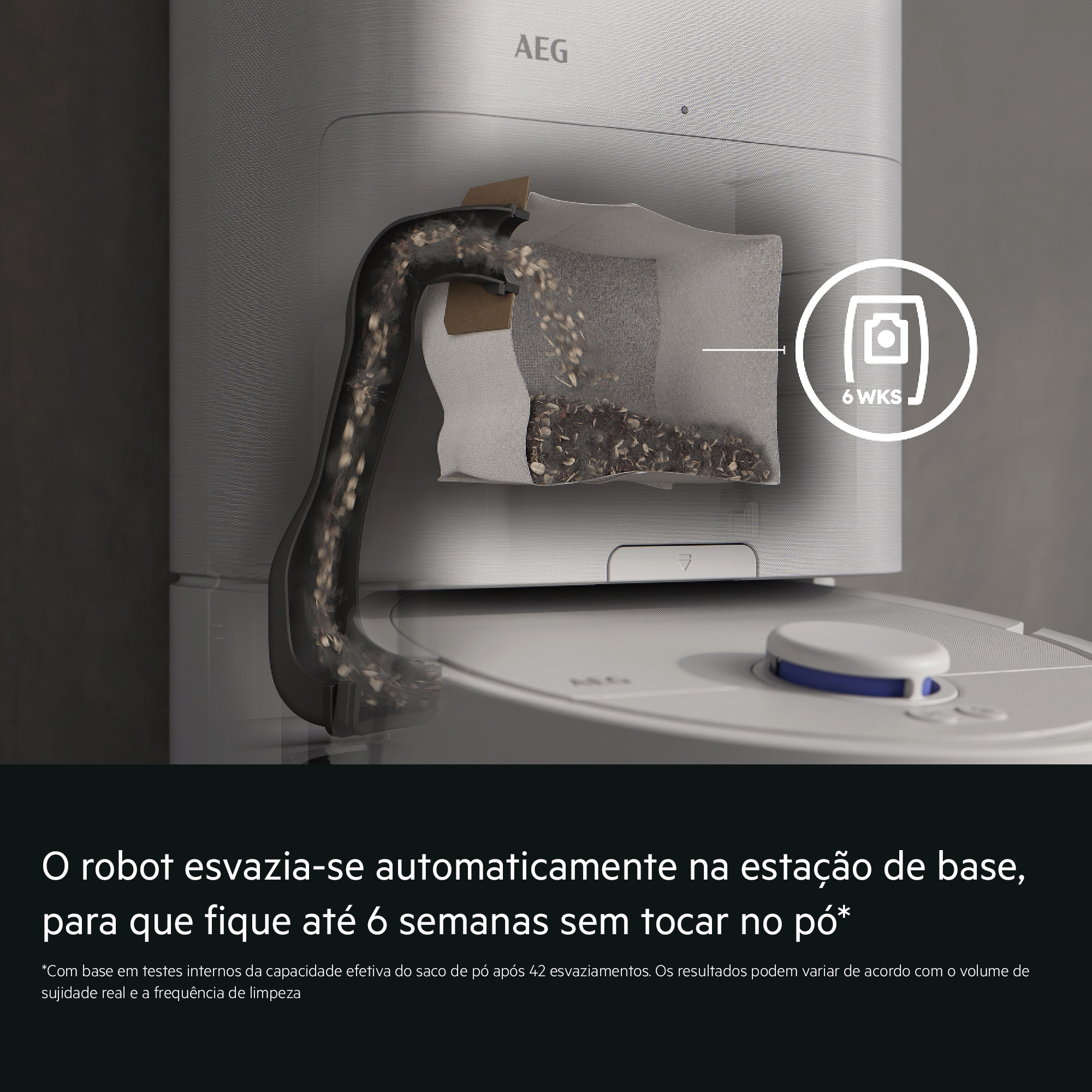 Aspirador robot AEG Trilobite com tecnologia Laser LiDAR, limpeza por zonas, função mopa, tempo de carregamento inferior a 6 horas, autonomia máxima de 208 minutos, potência de 7000 Pa, depósito de pó de 0,3 litros, depósito de água de 0,1 litros, app iOS e Android, controlo por voz, escova principal motorizada, base de carregamento e estação de esvaziamento com função de secagem a 60–65 °C, saco da estação com capacidade de 2,5 litros e reservatório de água de 3,2 litros, branco