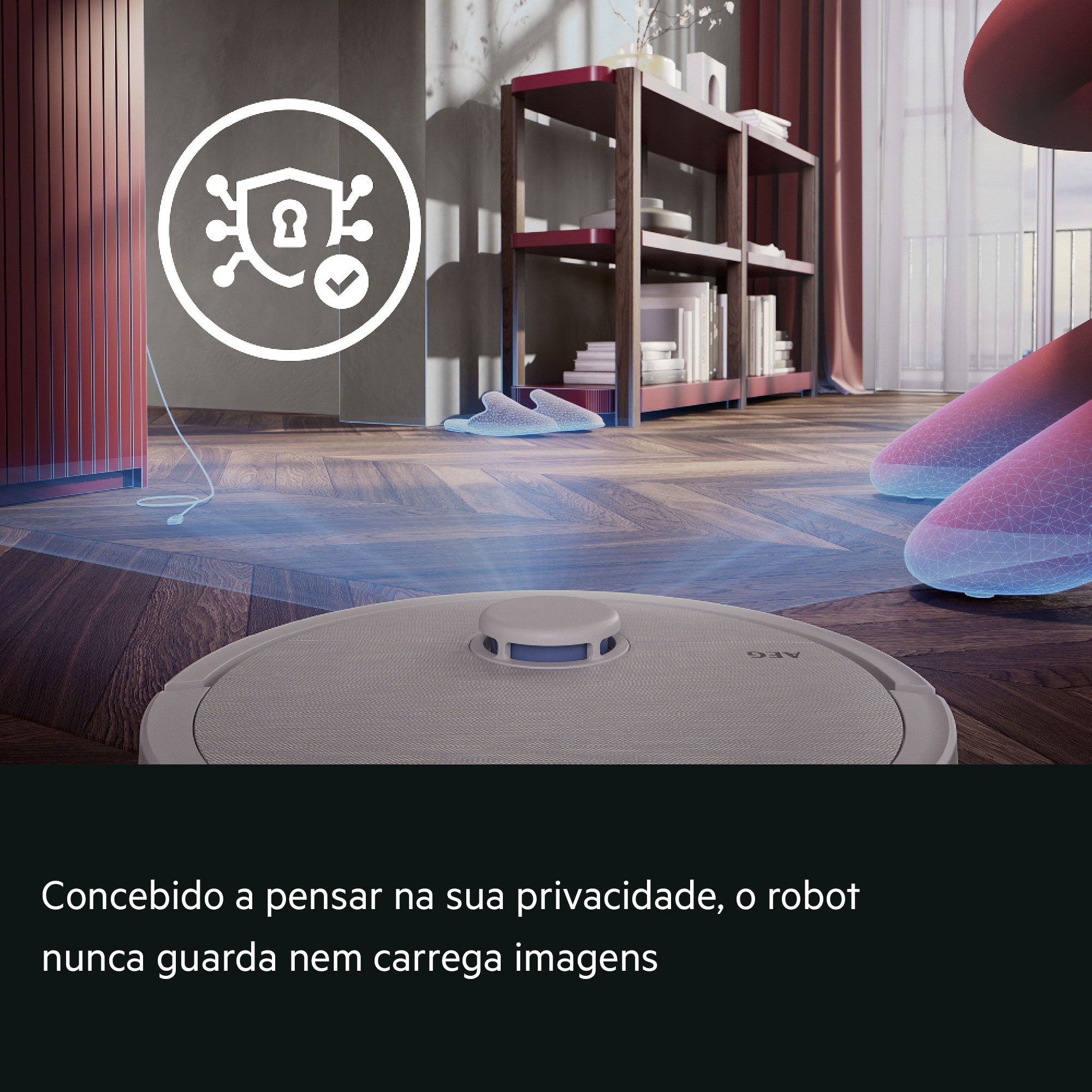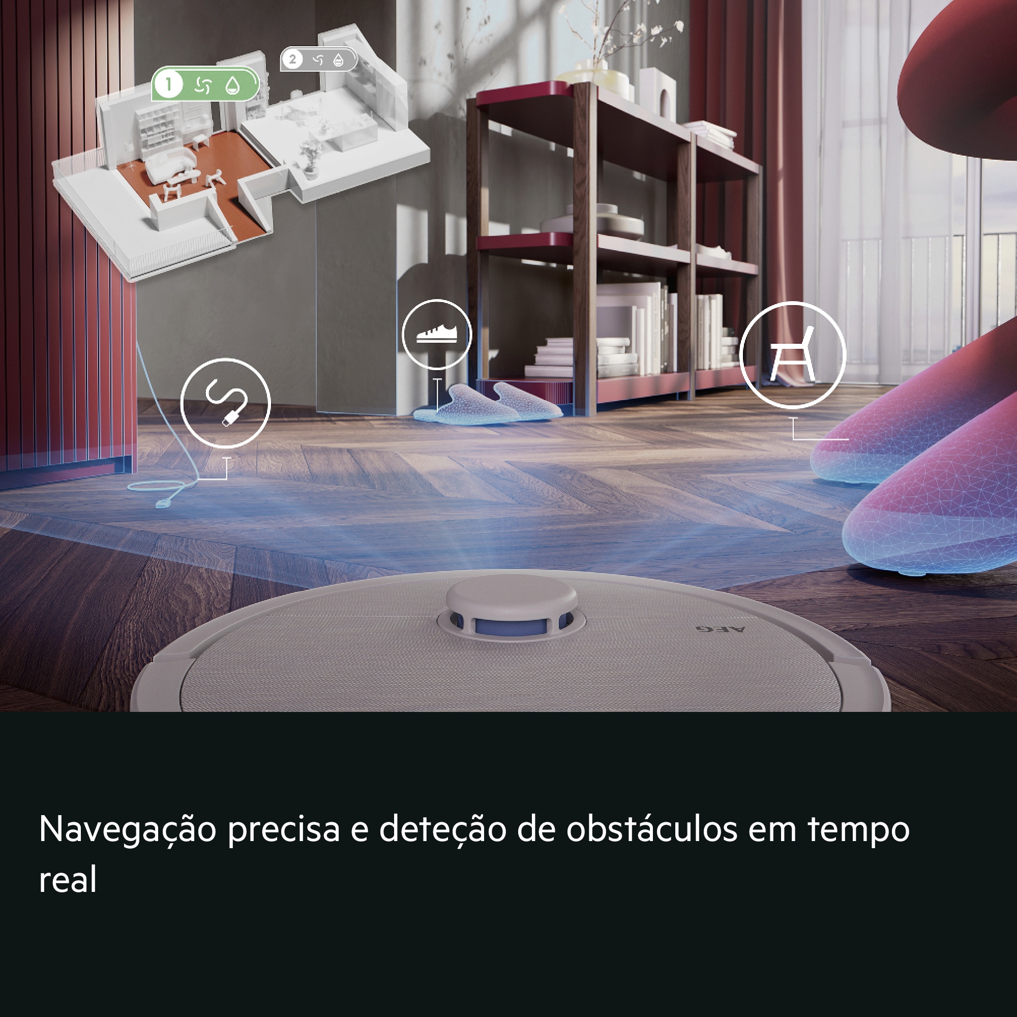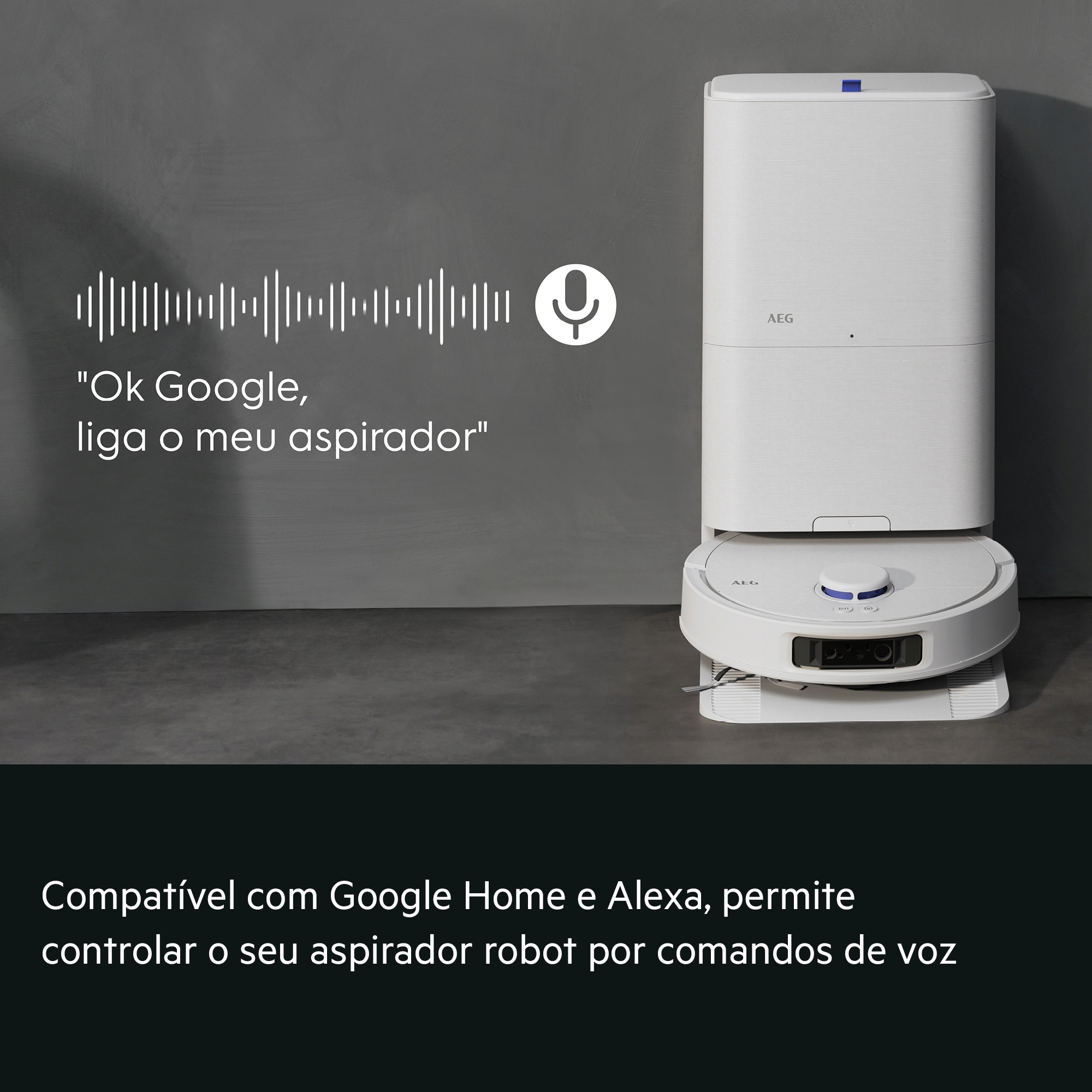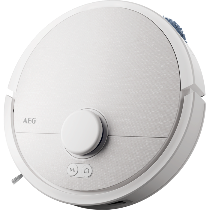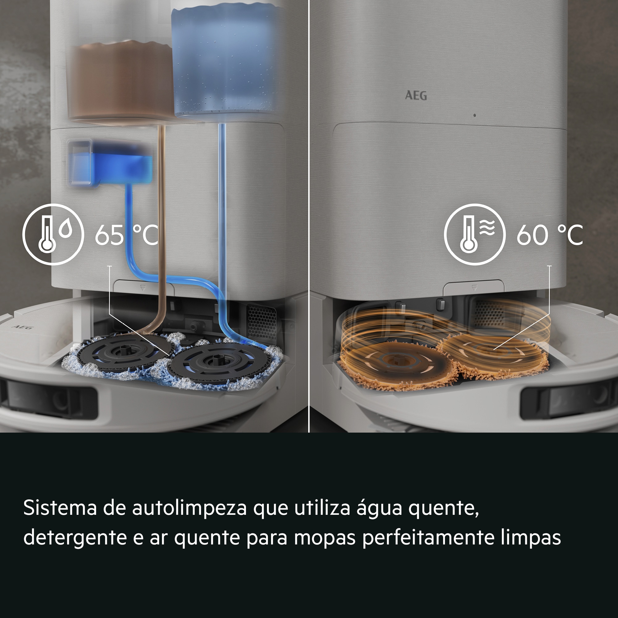 Aspirador robot AEG Trilobite com tecnologia Laser LiDAR, limpeza por zonas, função mopa, tempo de carregamento inferior a 6 horas, autonomia máxima de 208 minutos, potência de 7000 Pa, depósito de pó de 0,3 litros, depósito de água de 0,1 litros, app iOS e Android, controlo por voz, escova principal motorizada, base de carregamento e estação de esvaziamento com função de secagem a 60–65 °C, saco da estação com capacidade de 2,5 litros e reservatório de água de 3,2 litros, branco