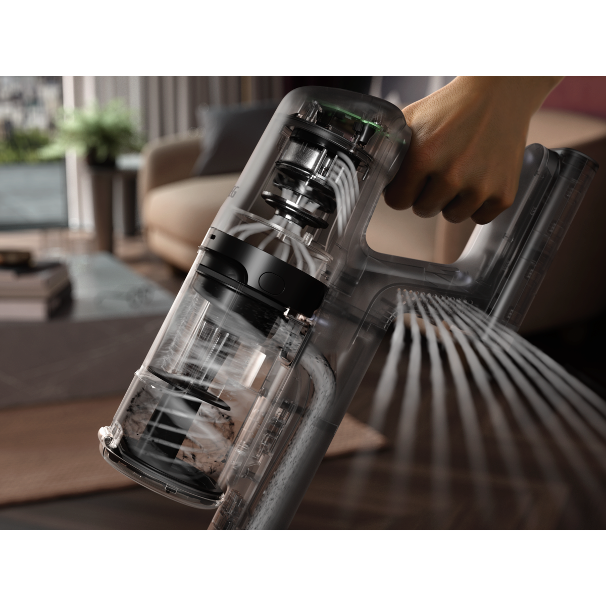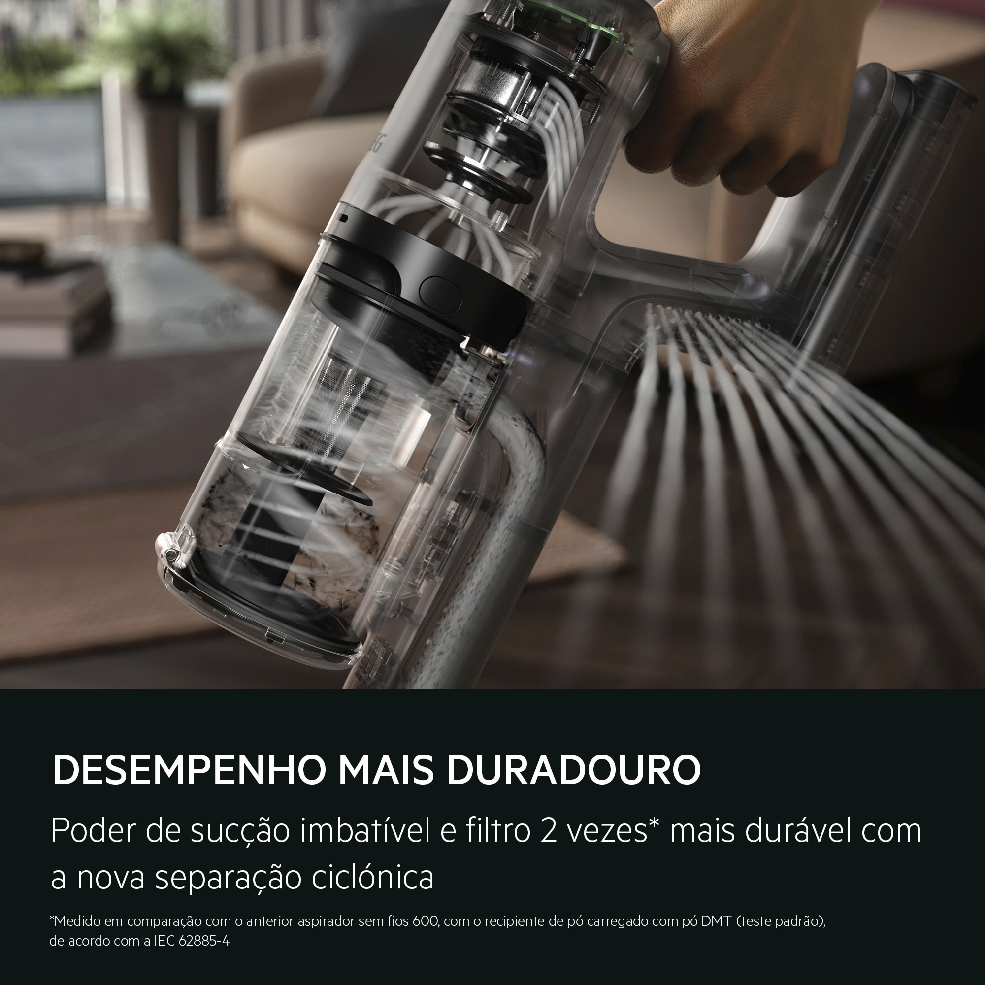 Medido em relação ao aspirador vertical 600 anterior com recipiente para pó carregado com pó DMT (teste padrão), de acordo com IEC 62885-4