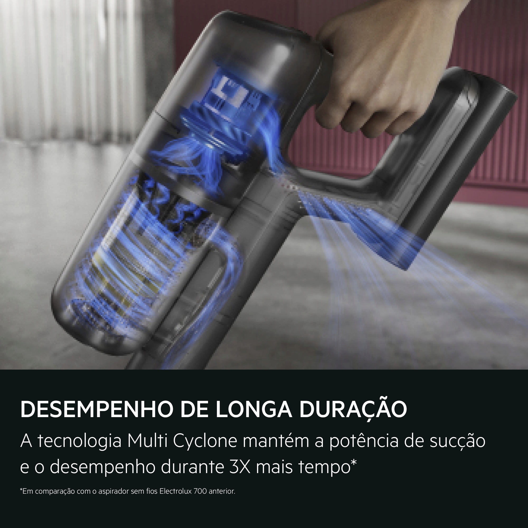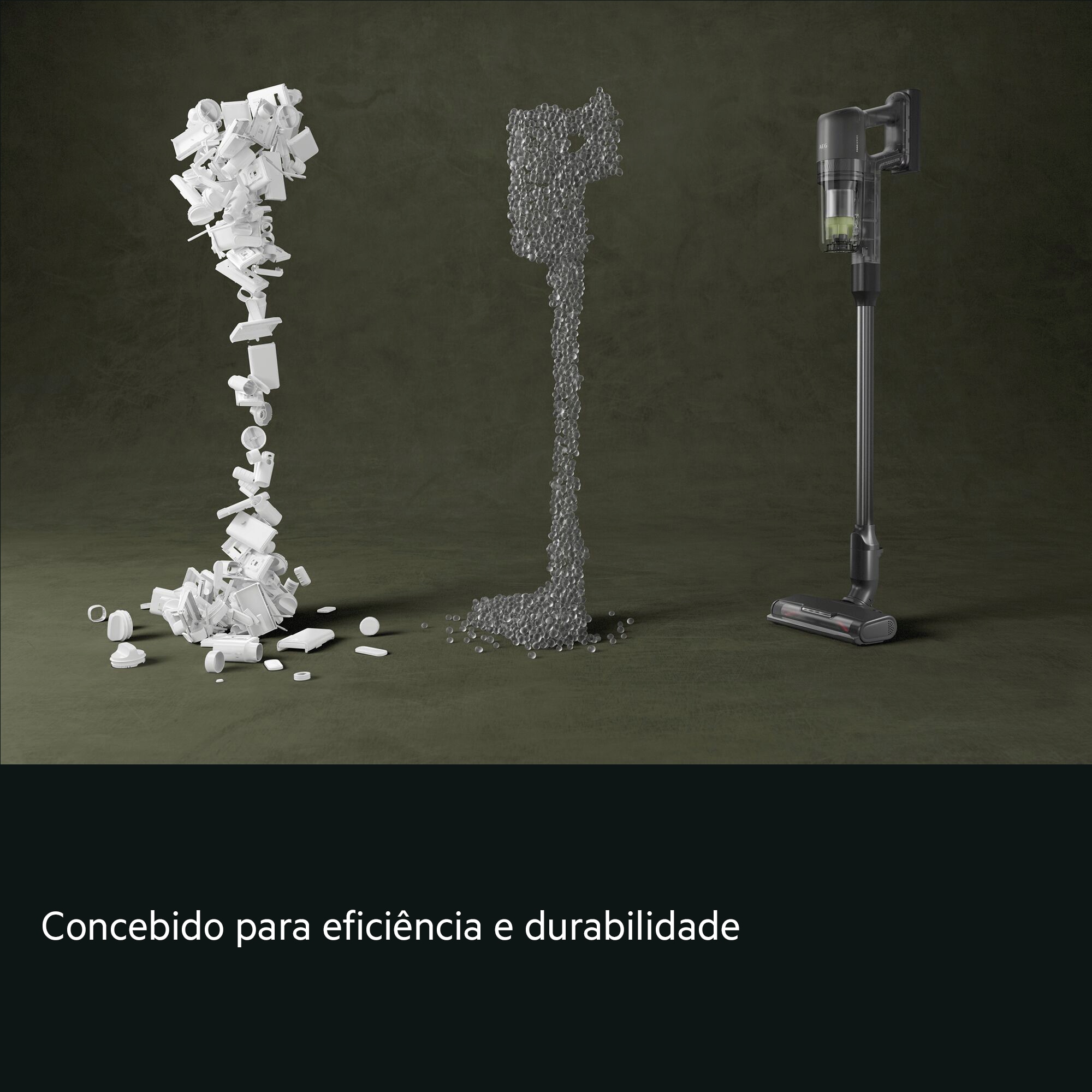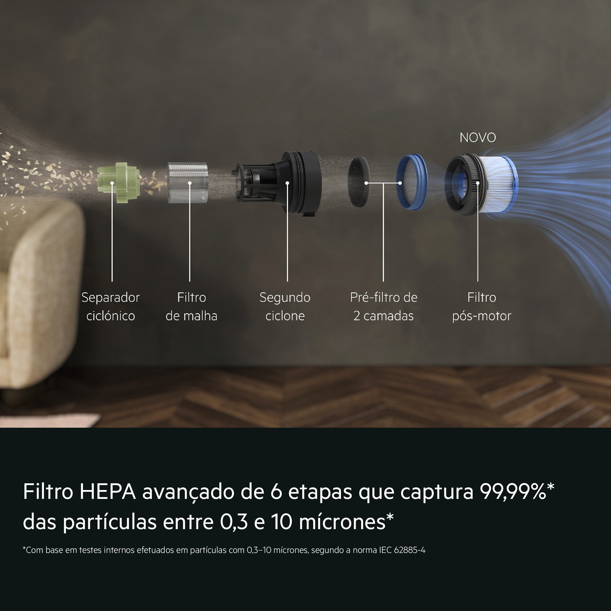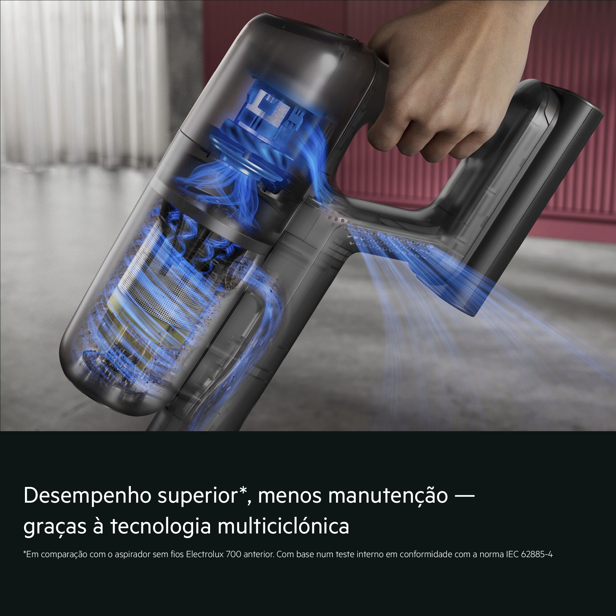 *Com base em teste interno segundo a norma IEC 62885-4.**Em comparação com motor de ciclone único em aspiradores sem fios.