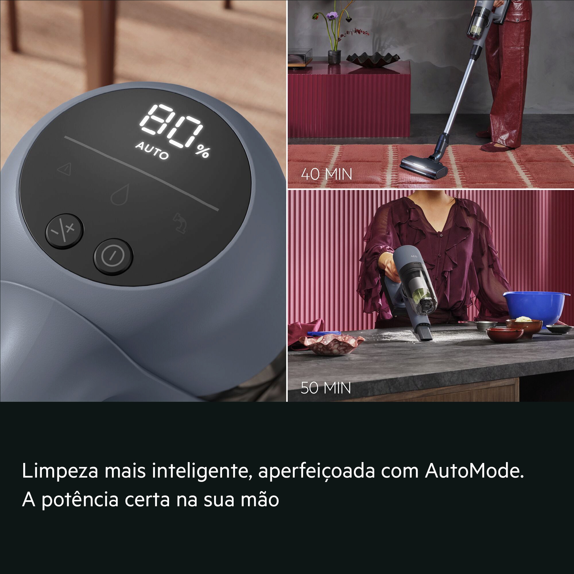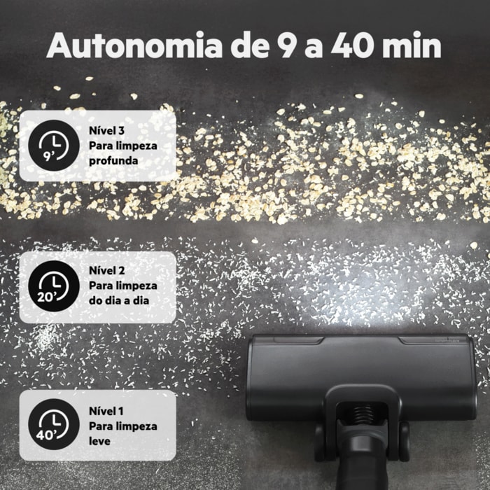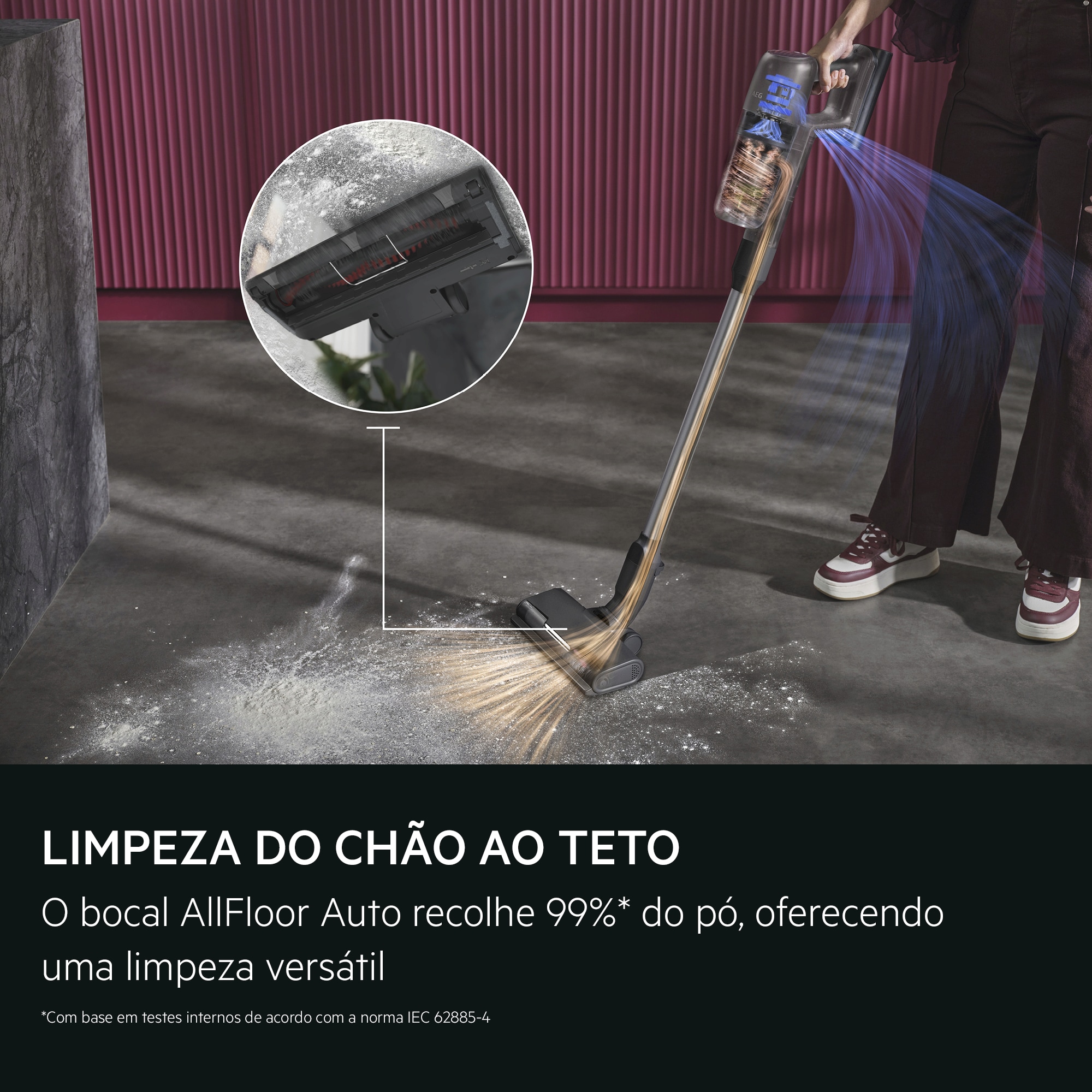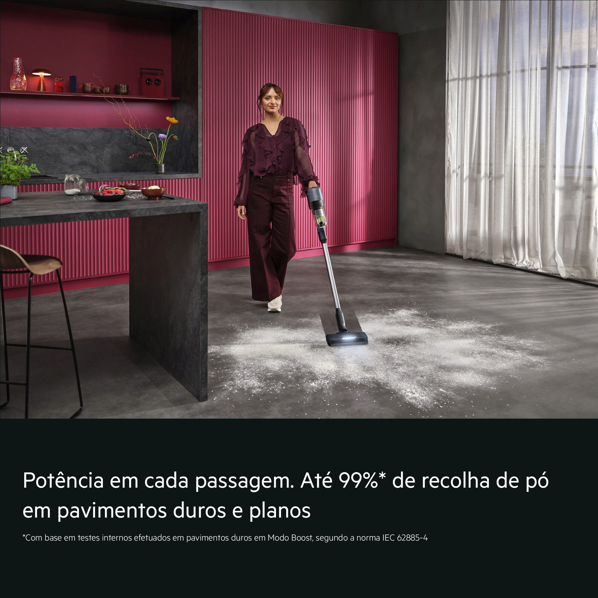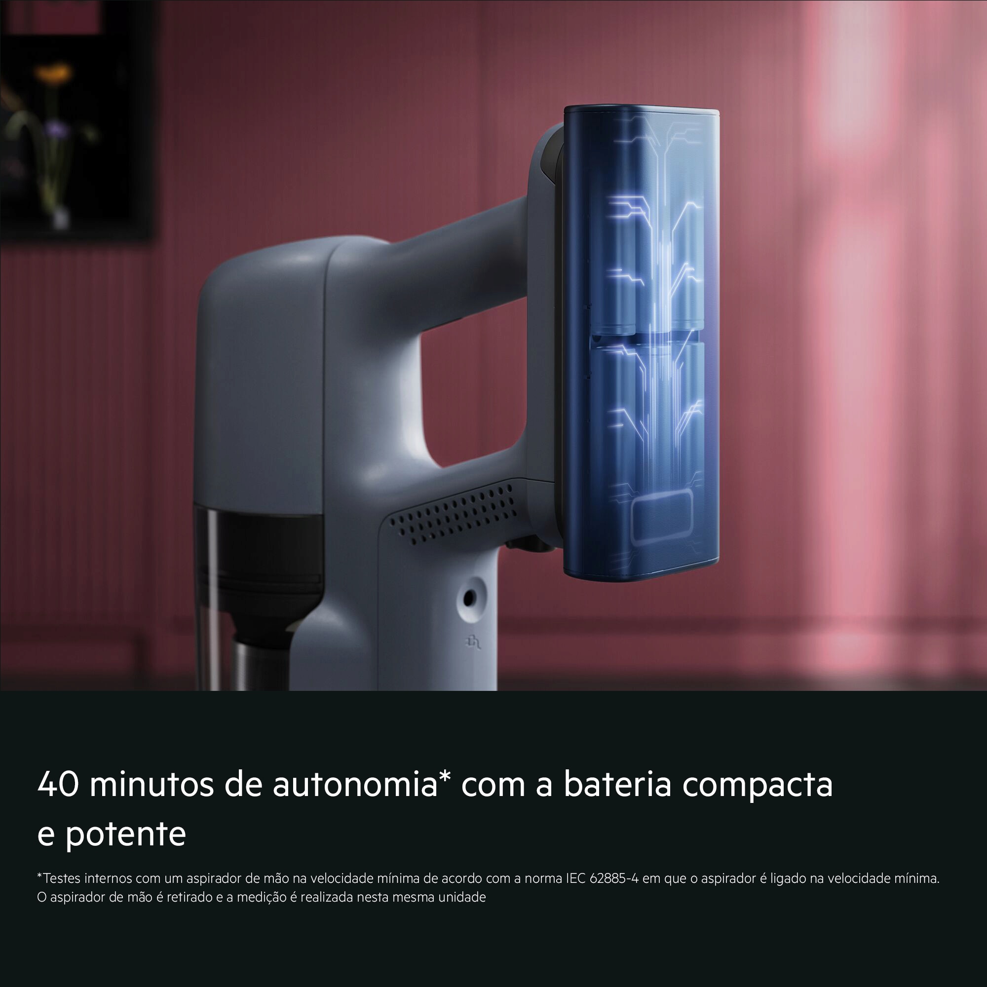 *Com base em testes internos segundo a norma IEC 62885-4, medindo o tempo de funcionamento da unidade manual e do aspirador completo. **Comparado com o tempo de funcionamento no modo Boost. ***Cobertura de limpeza com o aspirador completo, usando passagem dupla a uma velocidade de 0,5 m/s.