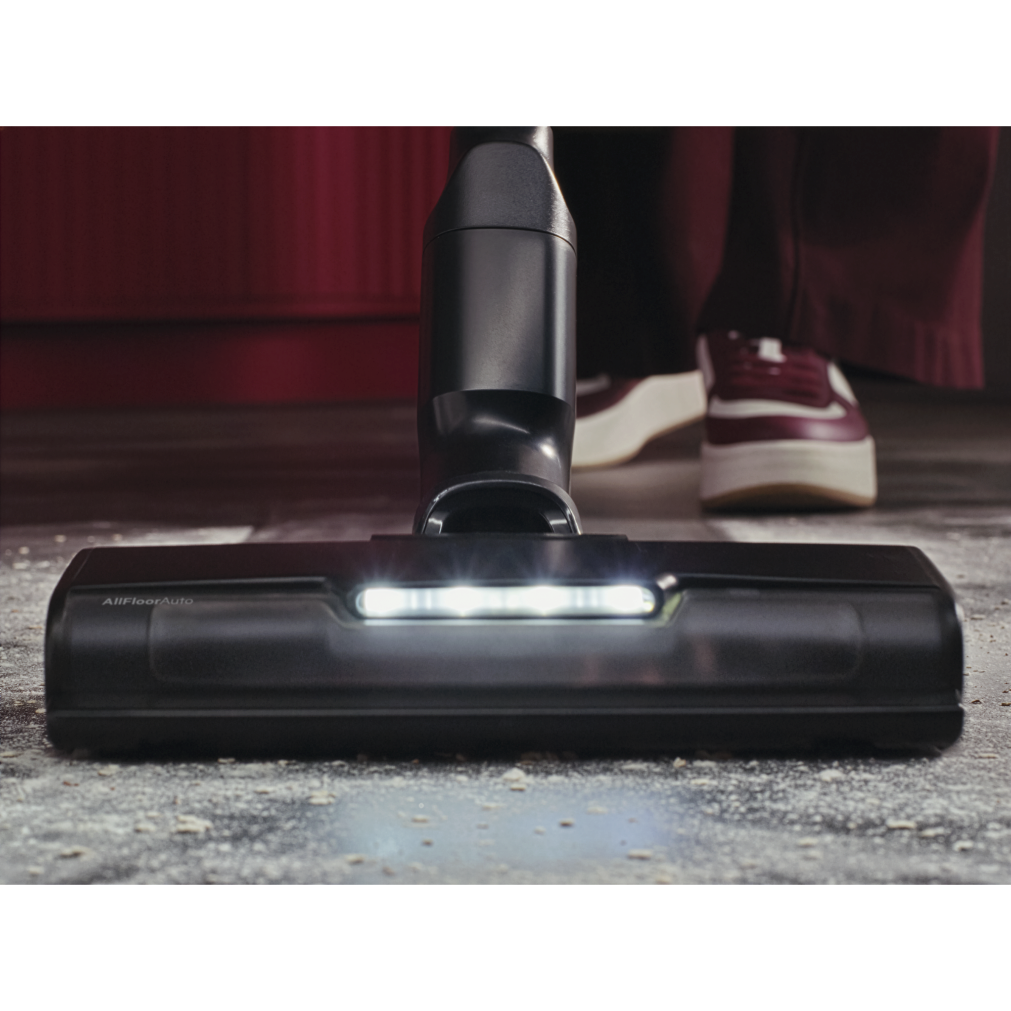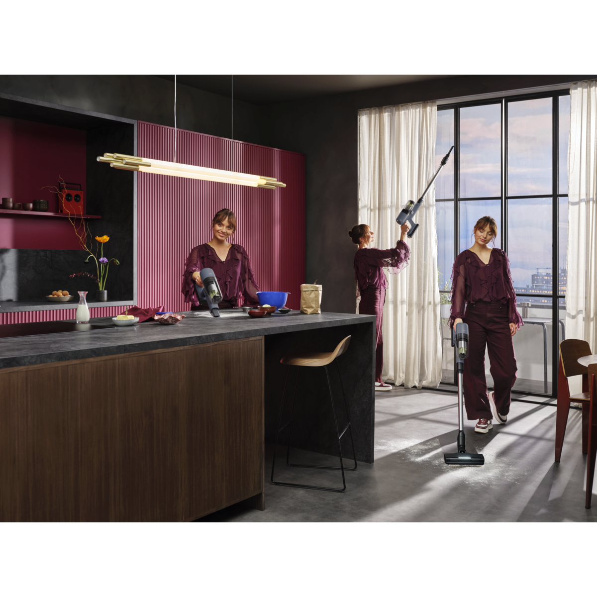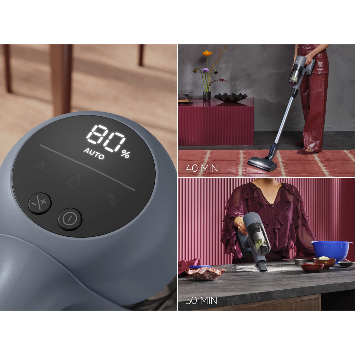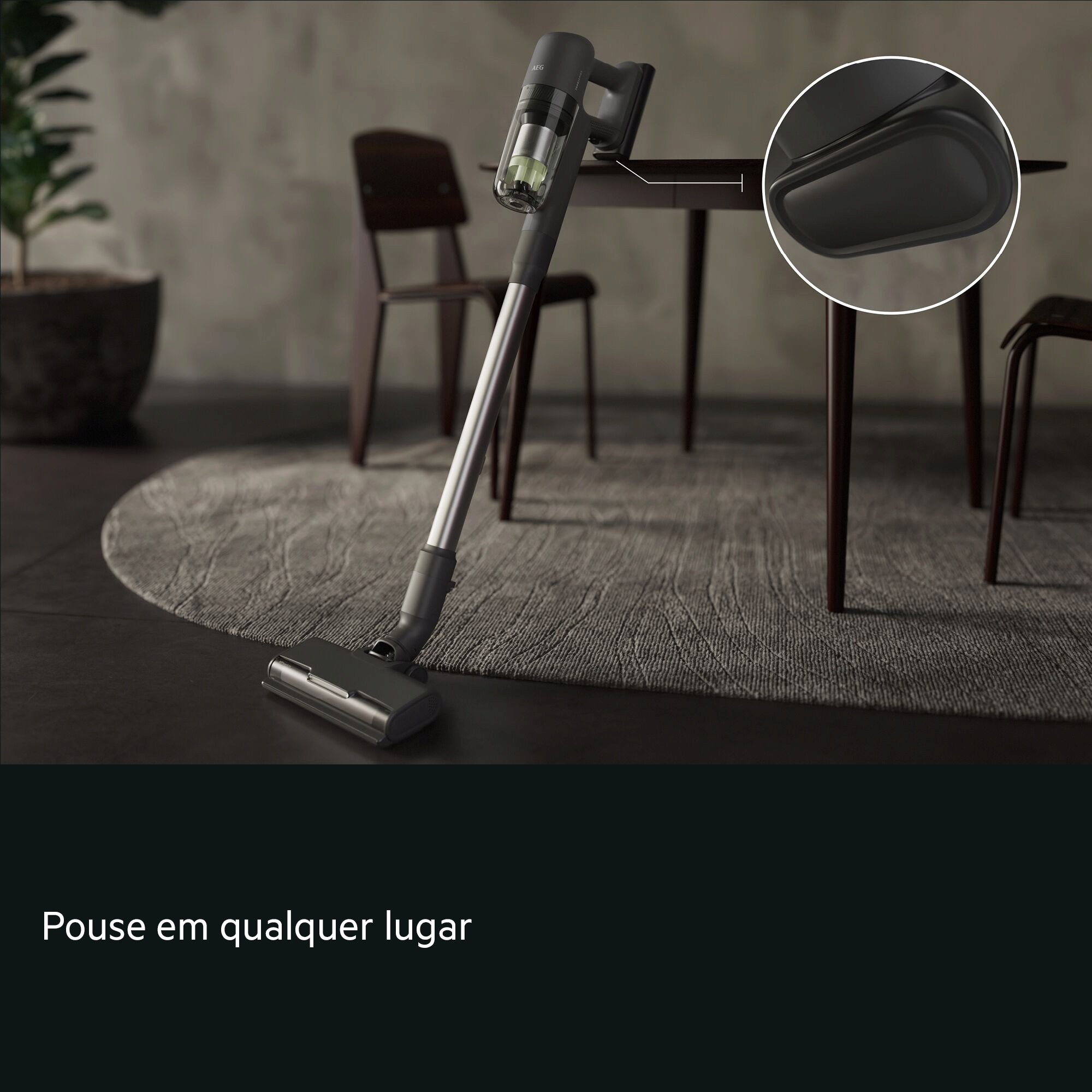 *Com base em testes internos segundo a norma IEC 62885-4, medindo o tempo de funcionamento da unidade manual e do aspirador completo. **Comparado com o tempo de funcionamento no modo Boost. ***Cobertura de limpeza com o aspirador completo, usando passagem dupla a uma velocidade de 0,5 m/s.