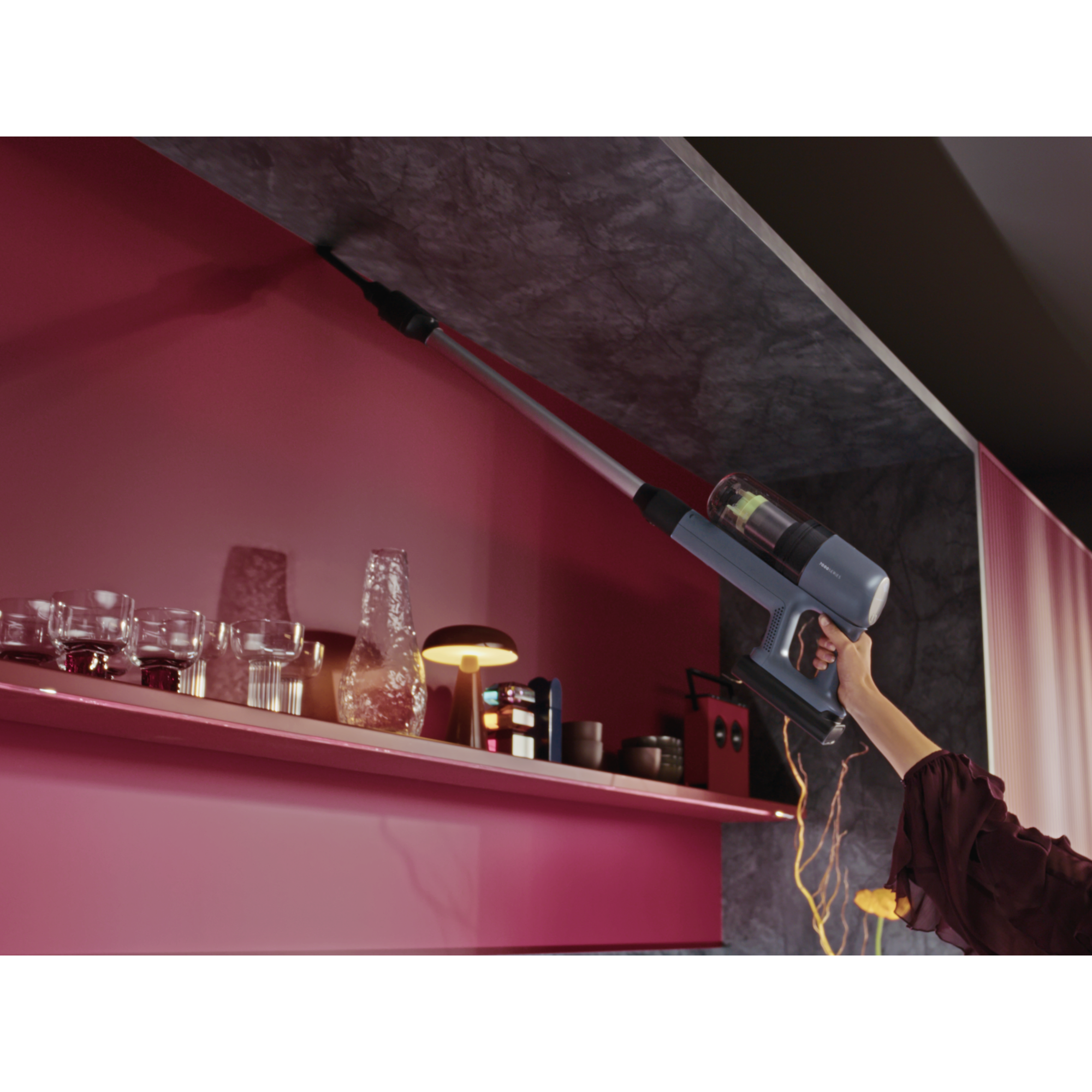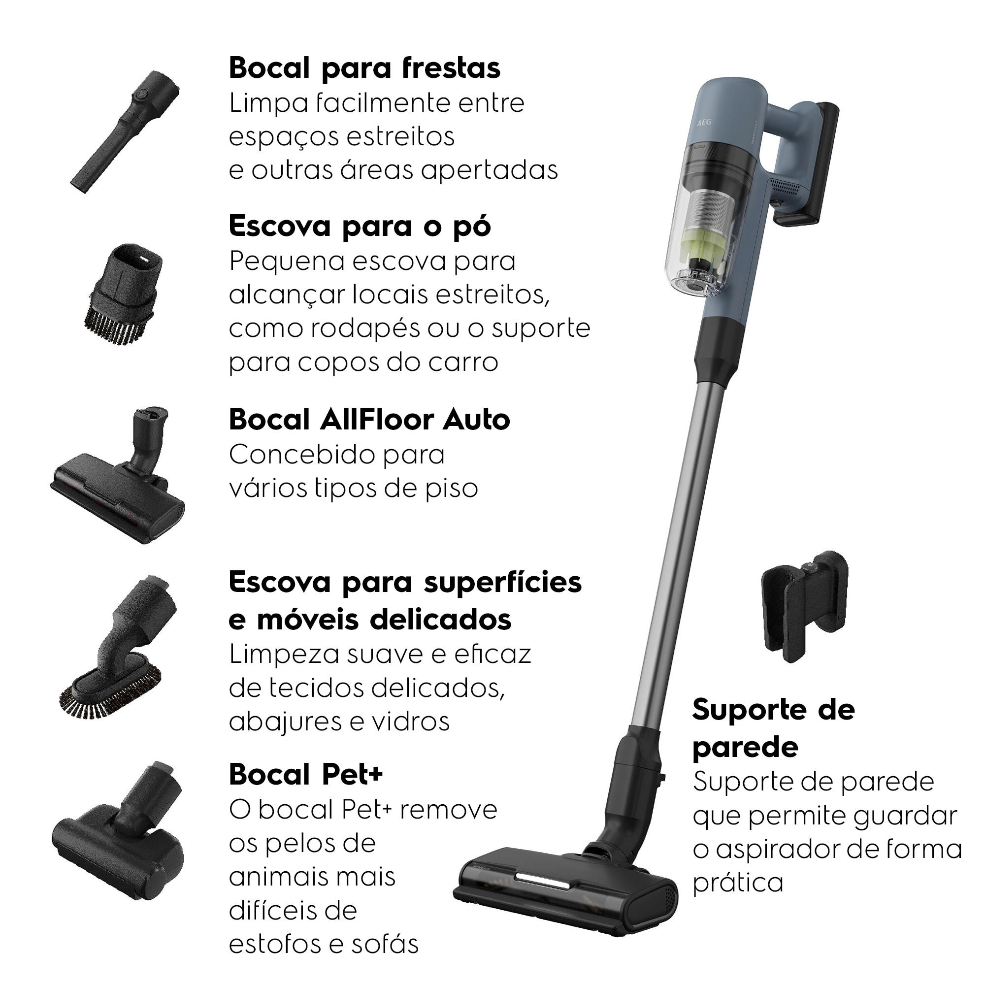Aspirador vertical Série 7000 Animal, com bateria de 21,6 V, tempo de carregamento de 4,5 horas, autonomia de 9/20/40/50 minutos (3 velocidades), depósito com capacidade de 0,3 litros, escova AllFloor Multisuperfícies, 4 acessórios, escova PetPro+, cinzento azulado